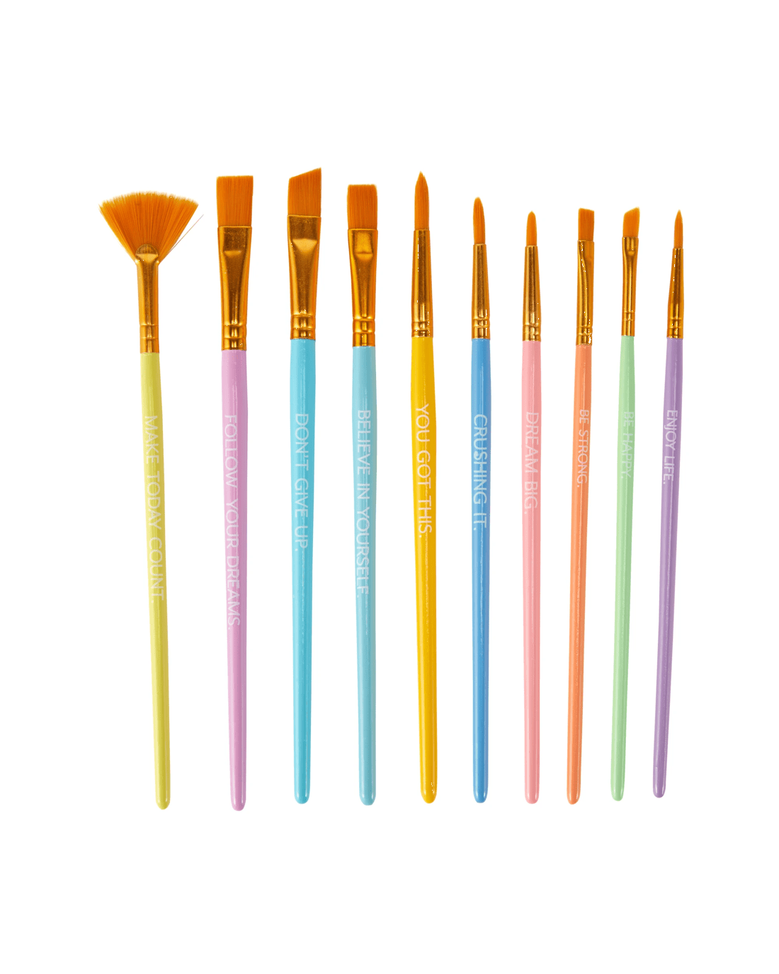 Features- 'ENJOY LIFE', 'BE HAPPY', 'BE STRONG', 'DREAM BIG', 'CRUSHING IT', 'YOU GOT THIS', 'BELIEVE IN YOURSELF', 'DON'T GIVE UP', FOLLOW YOUR DREAMS' and 'MAKE TODAY COUNT' text printed on the brushes