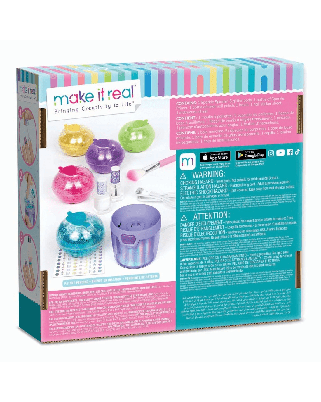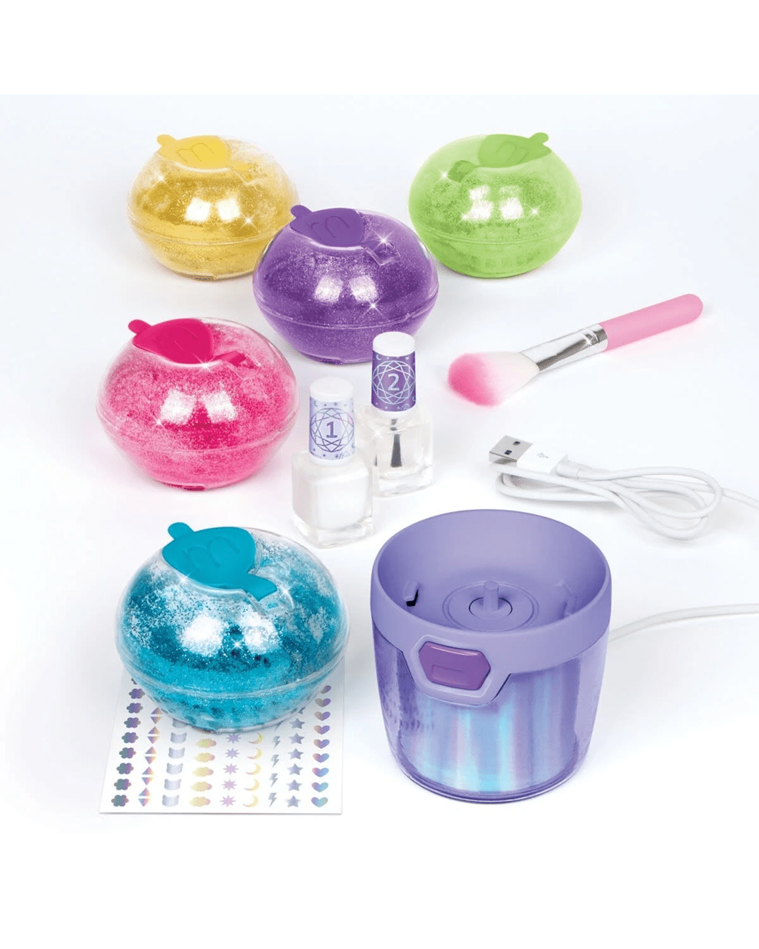 - Includes 1 x sparkle spinner, 5 x glitter pods, 1 x bottle of sparkle primer, 1 x bottle of clear nail polish, 1 x brush, 1 x nail sticker sheet and 1 x instruction sheet