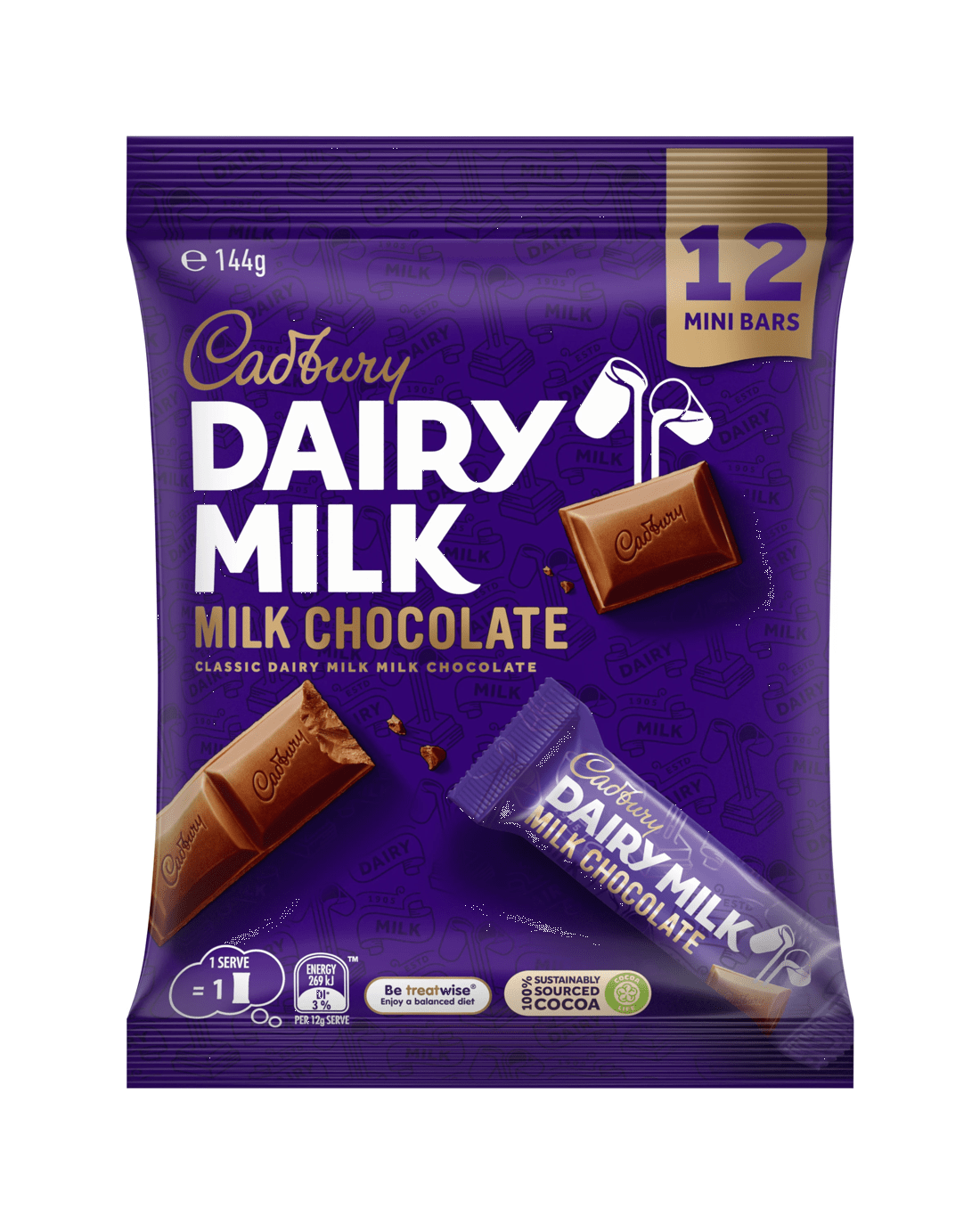 12 mini bars, perfect for sharing or snacking! The equivalent of a glass and a half of full cream milk in every 200g of Cadbury Dairy Milk milk chocolate.