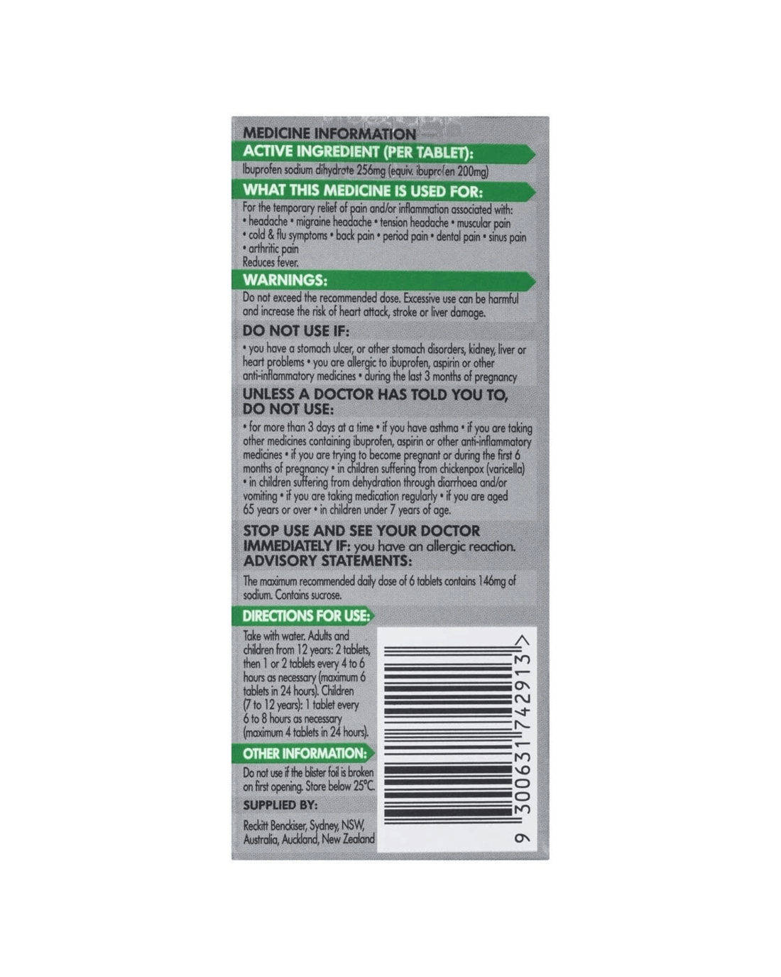 - Active ingredient: Ibuprofen sodium dihydrate (equiv. ibuprofen 200 mg)