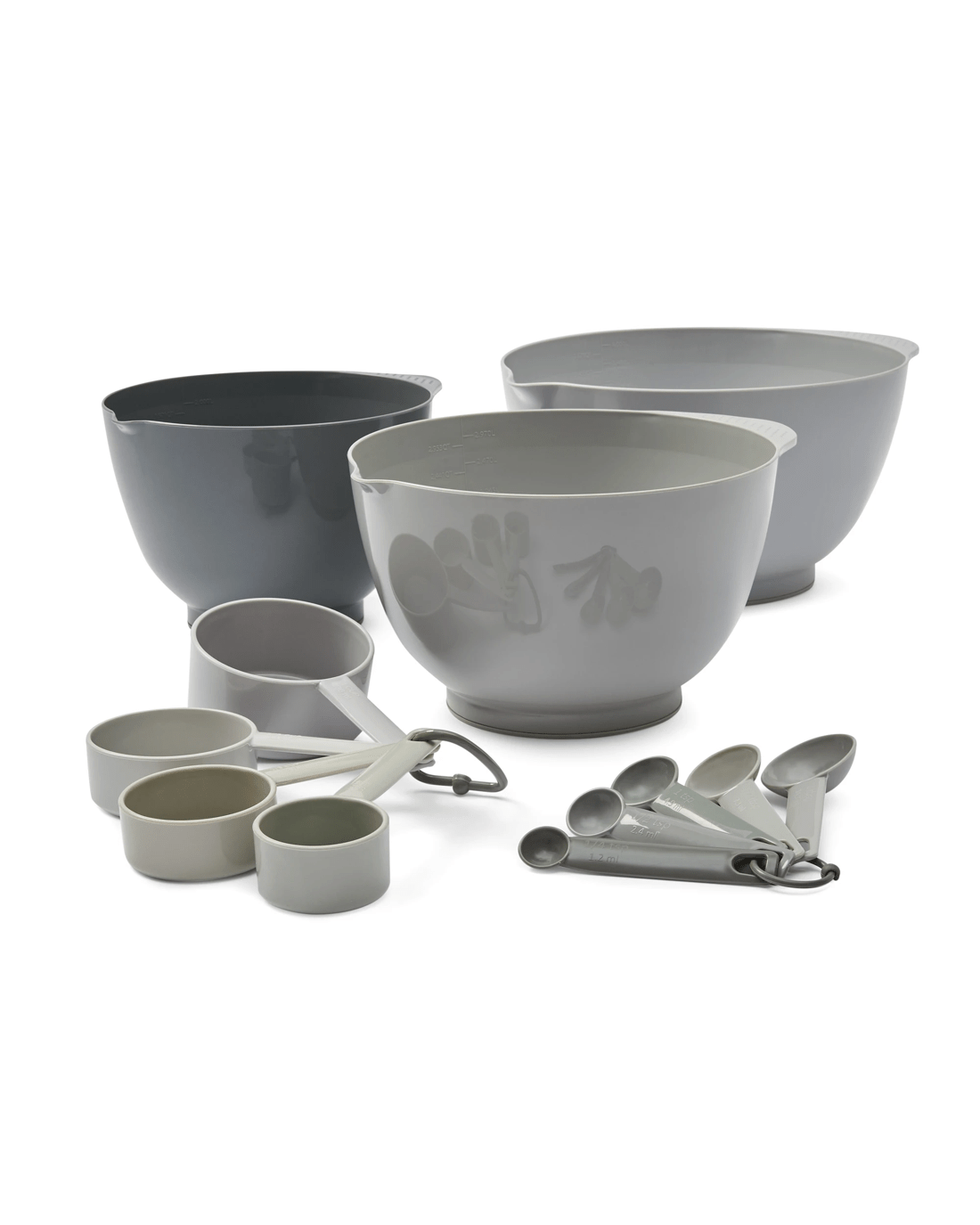- Includes 3 x mixing bowls, 4 x measuring cups (1 cup, 1/2 cup, 1/3 cup, 1/4 cup), 5 x measuring spoons (1 tbsp, 1/2 tbsp, 1 tsp, 1/2 tsp, 1/4 tsp)