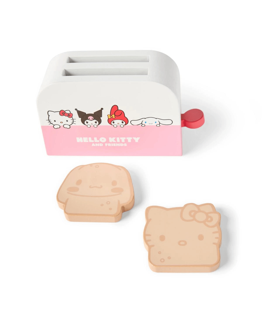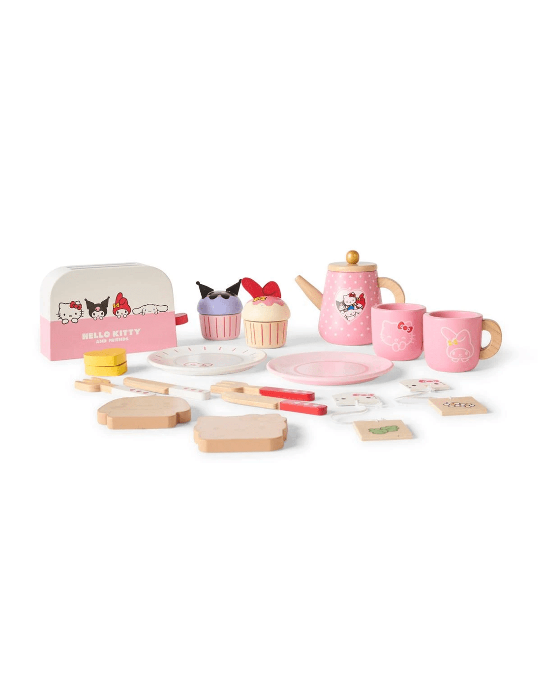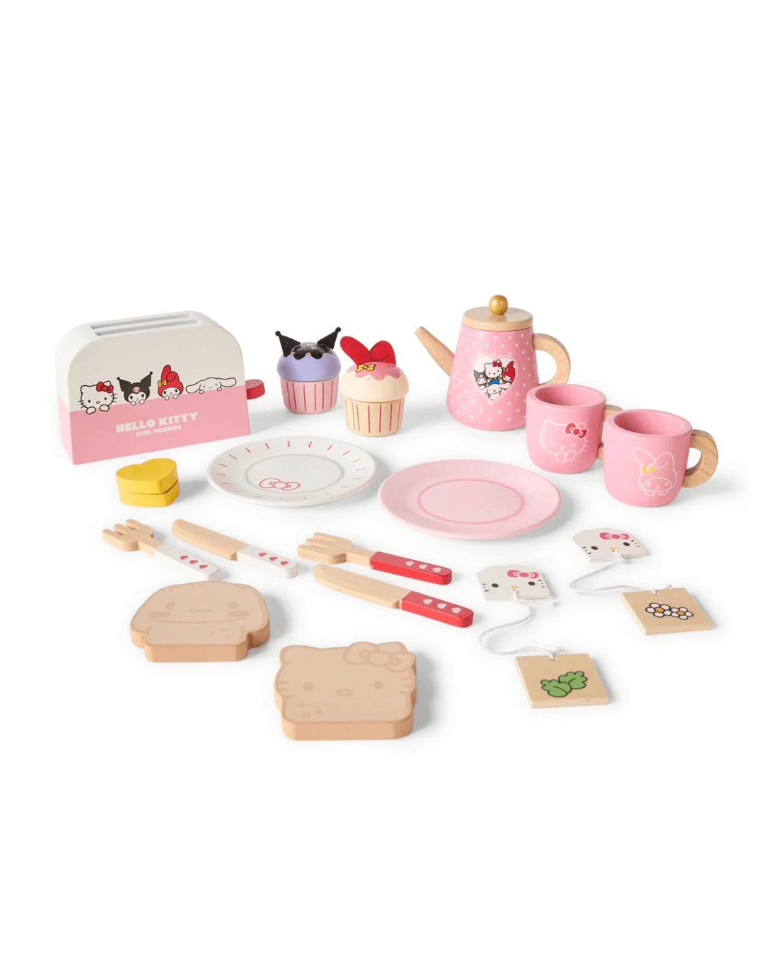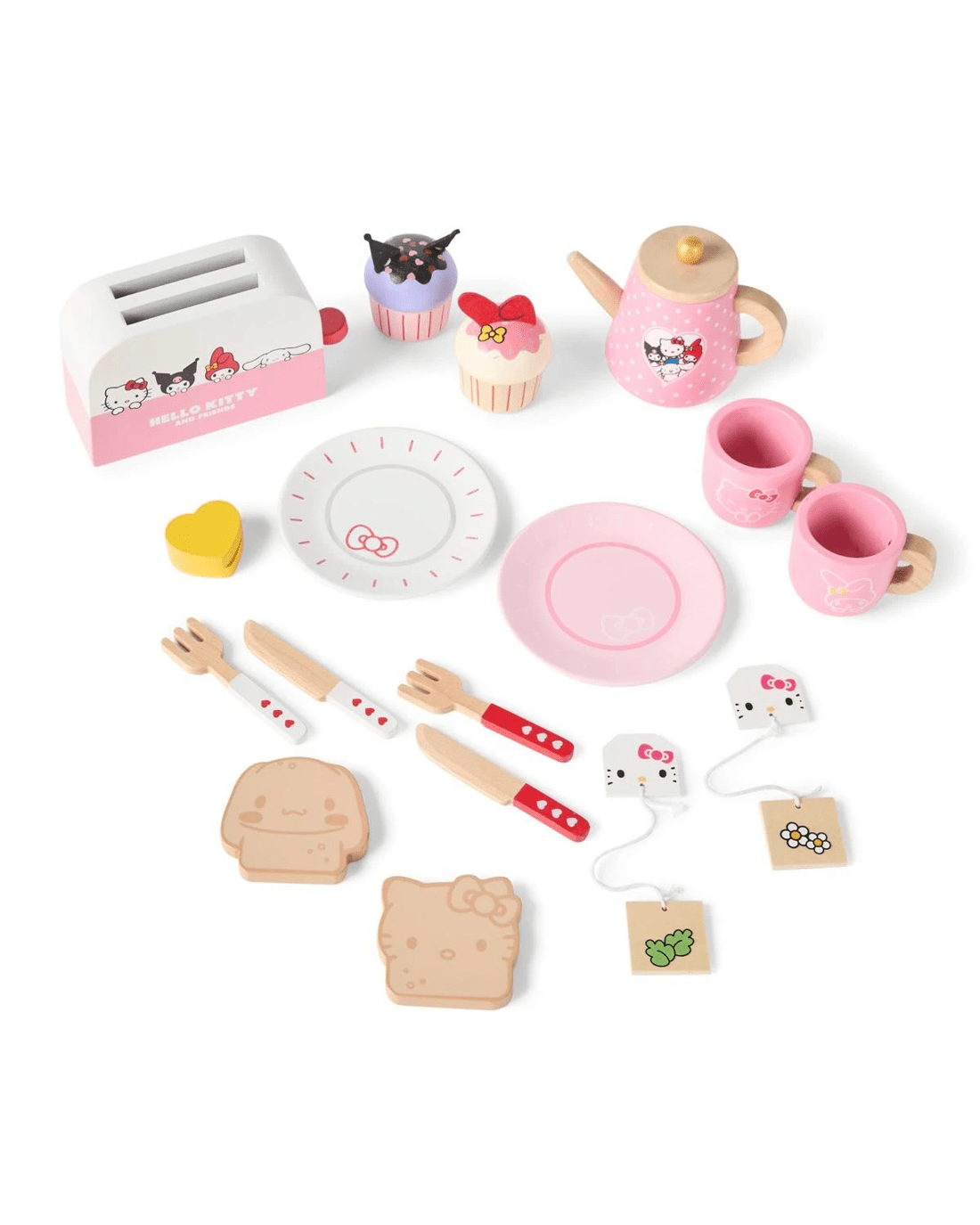 • Includes 1 x pink plate, 1 x red knife and fork, 1 x white plate, 1 x white knife and fork, 1 x sliceable butter, 1 x toaster, 1 x Hello Kitty toast, 1 x Cinnamoroll toast, 1 x tea pot, 2 x mugs, 2 x tea bags and 2 x sliceable cupcakes