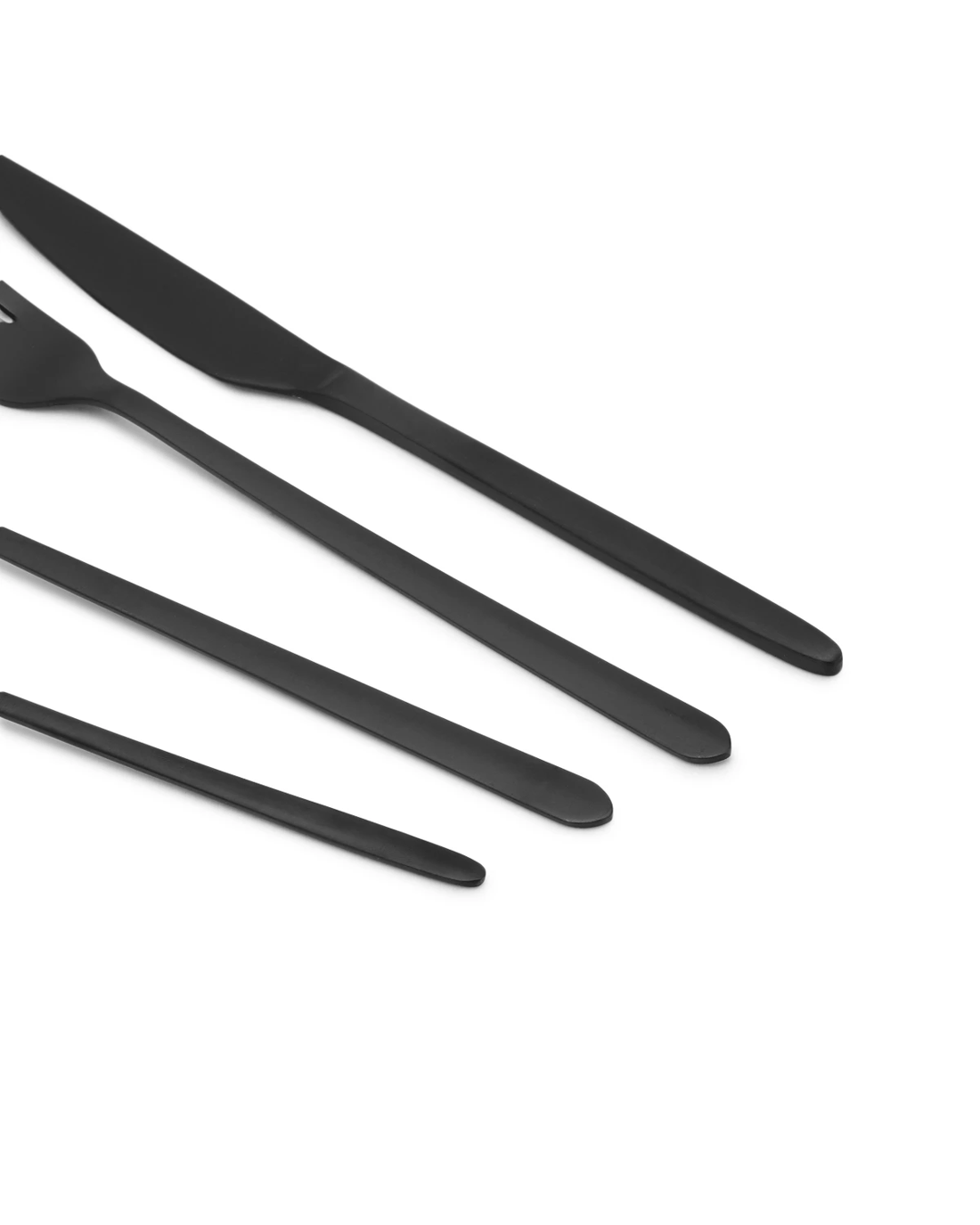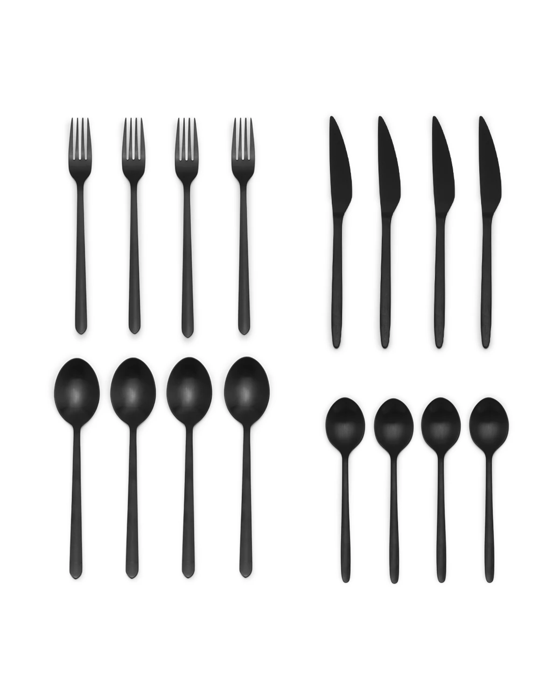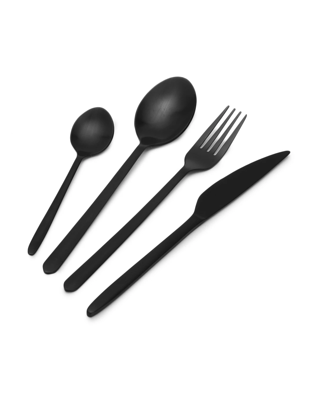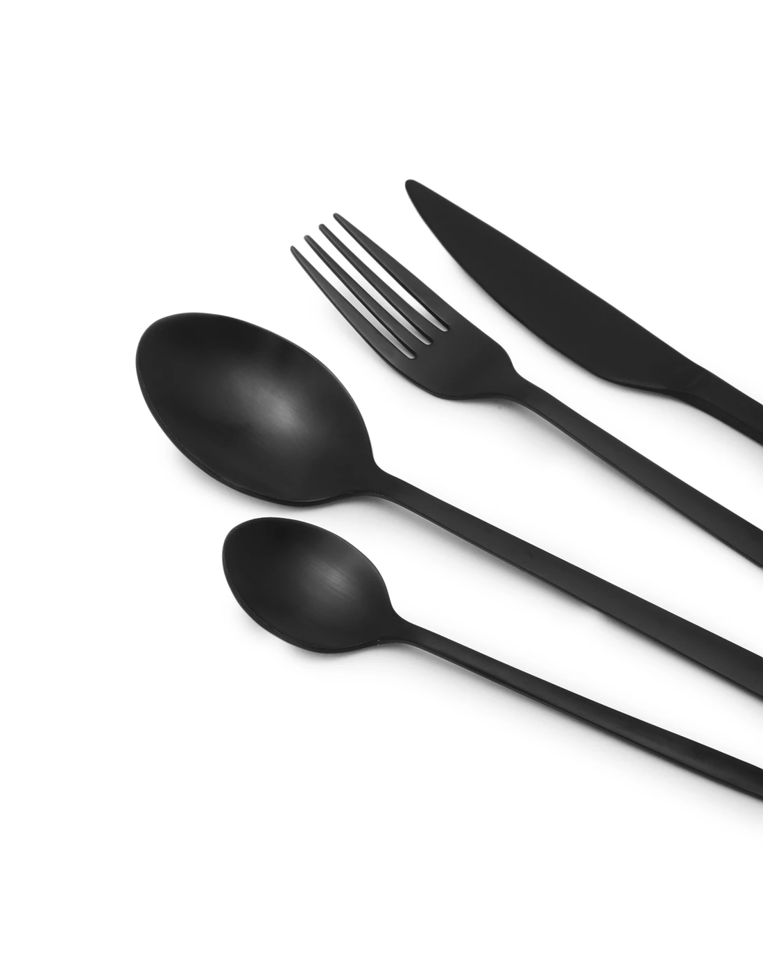 This elegant Matte Black Cutlery Set includes everything you need for a complete table setting, featuring knives, forks, spoons and teaspoons.