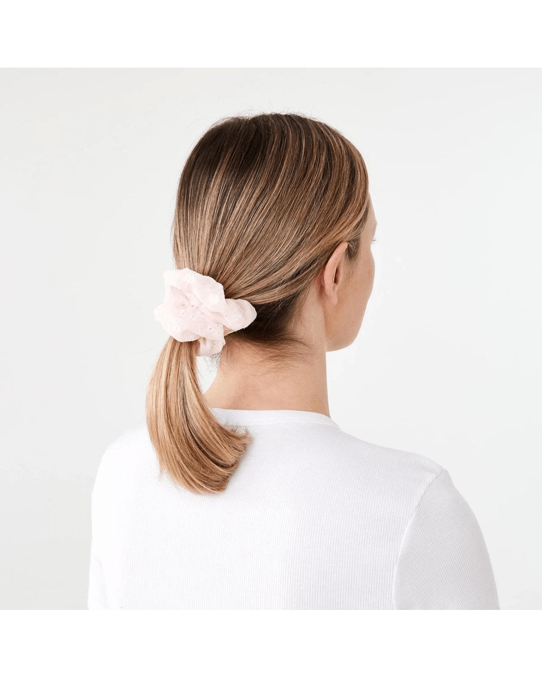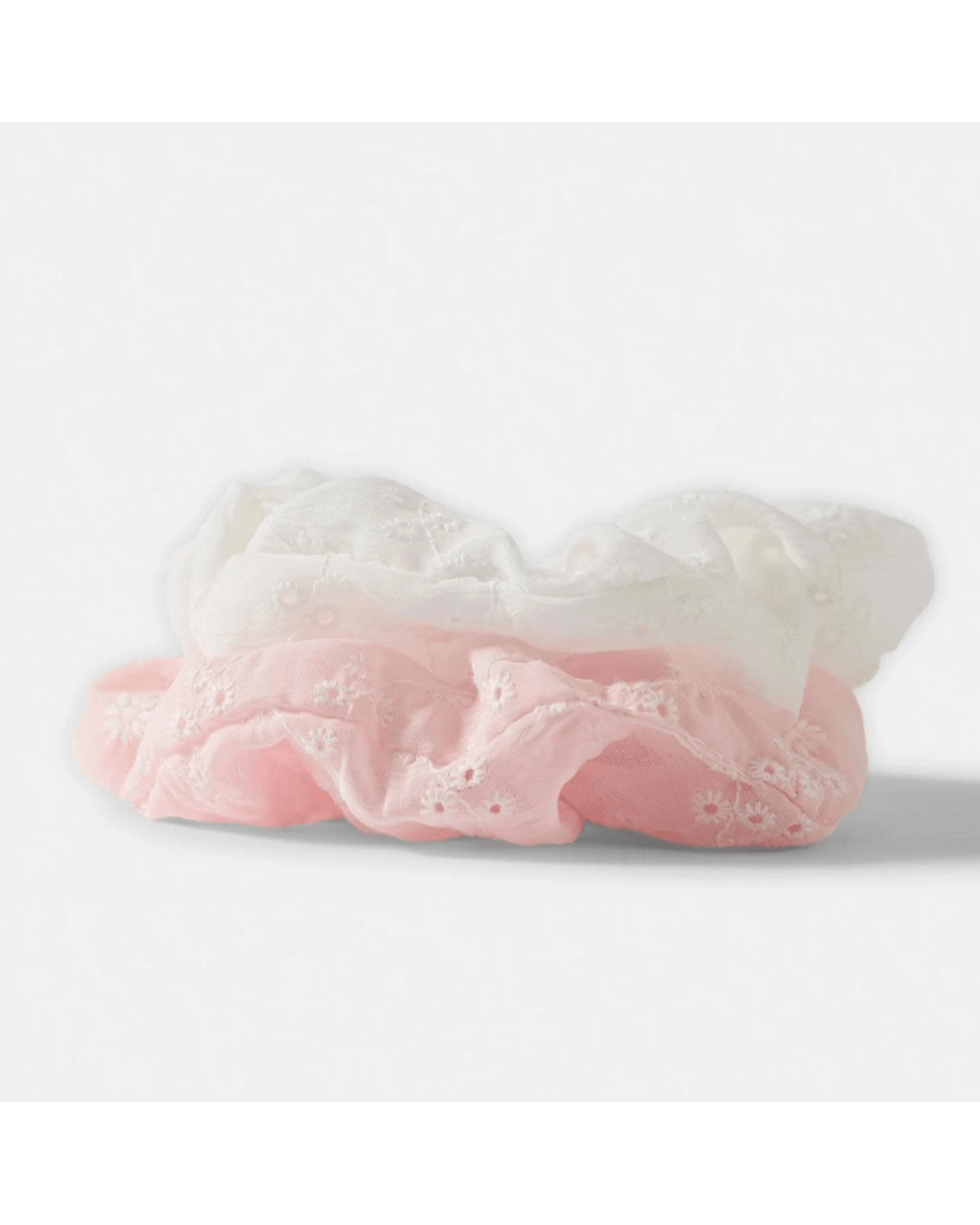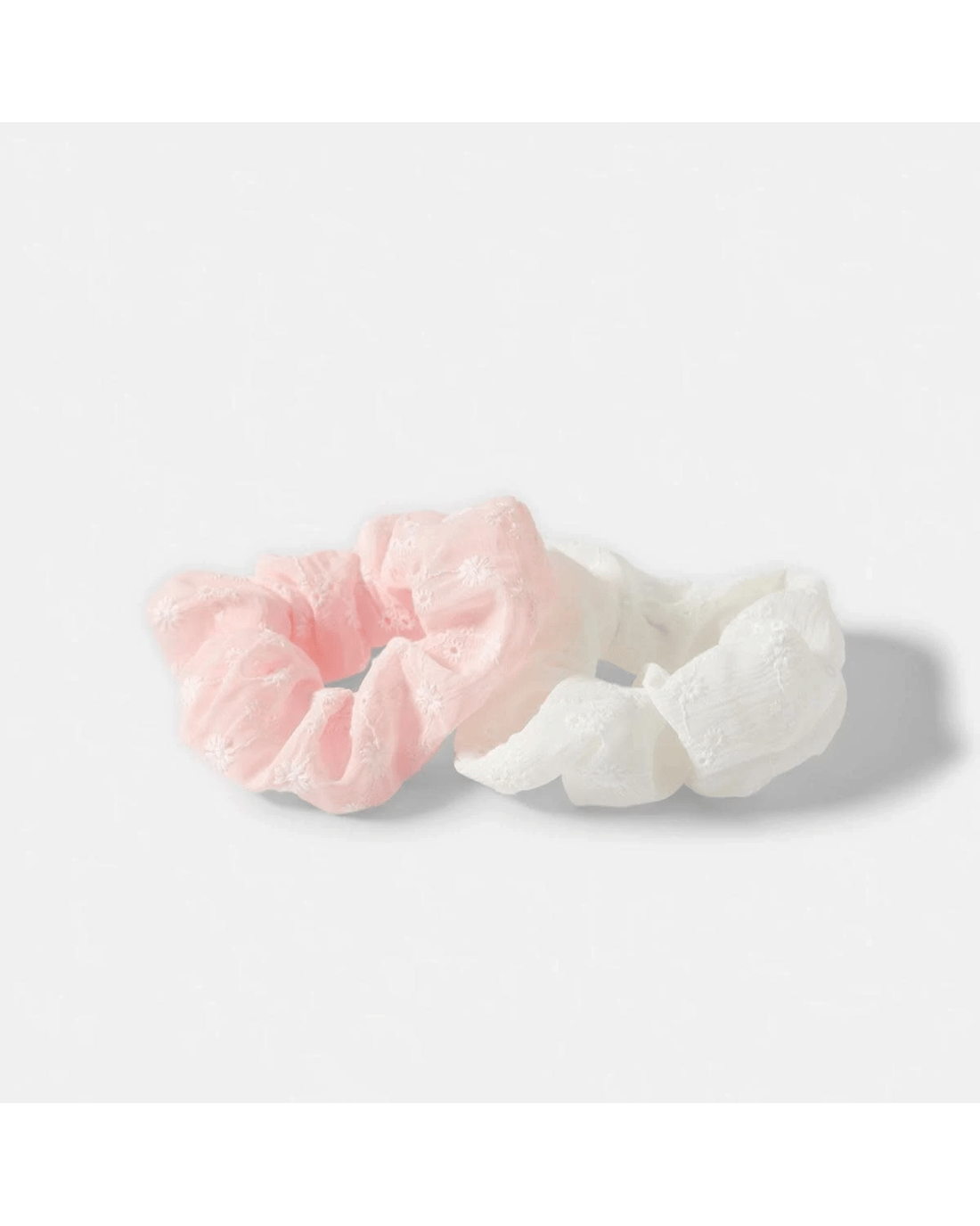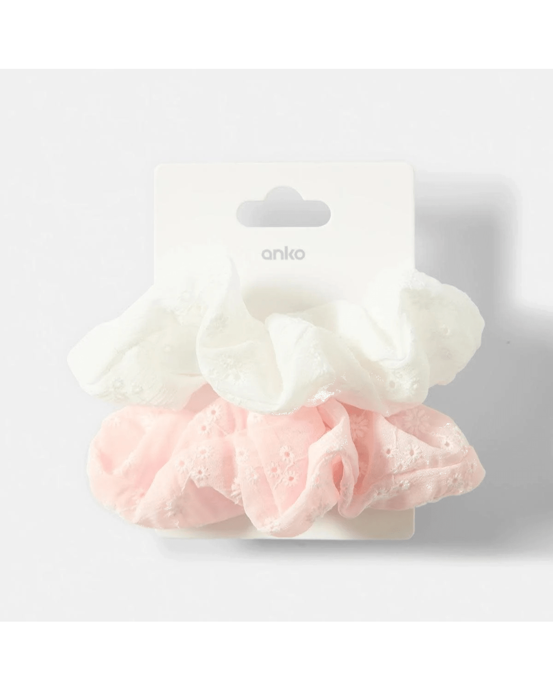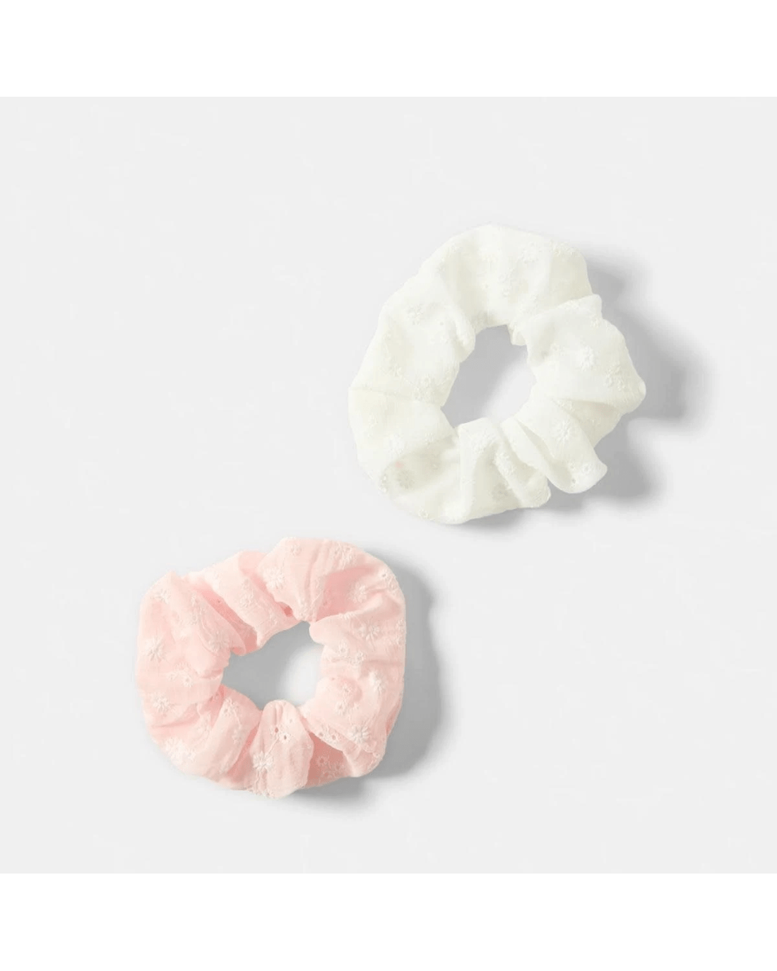 Add a charming touch to your hairstyle with the 2 Pack Embroidered Flower Hair Scrunchies in pink and white - stylish and perfect for everyday elegance or special occasions.