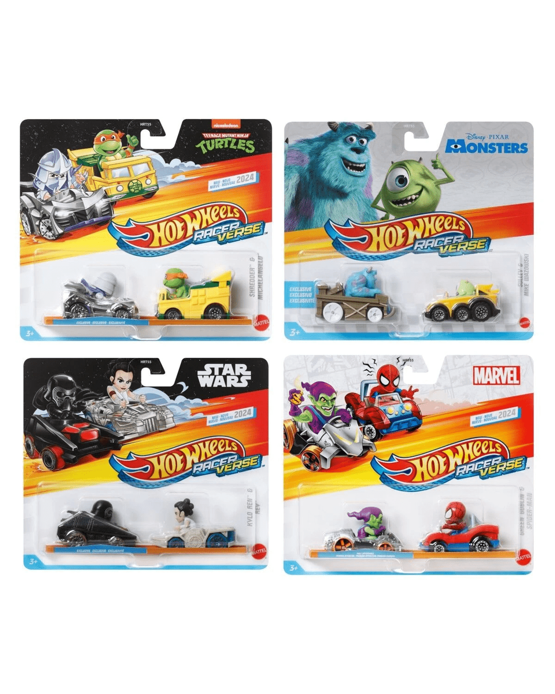 *Each sold separatelyAdd some characters to Hot Wheels car play with a Hot Wheels RacerVerse 2-Pack! Each of these die-cast toy vehicles has a non-removable character figure in the driver's seat of a themed car that's optimised for its performance on Hot Wheels tracks. Choose a favourite duo from popular entertainment properties like Disney, Warner Bros., Paramount, Mattel and Universal or collect them all!