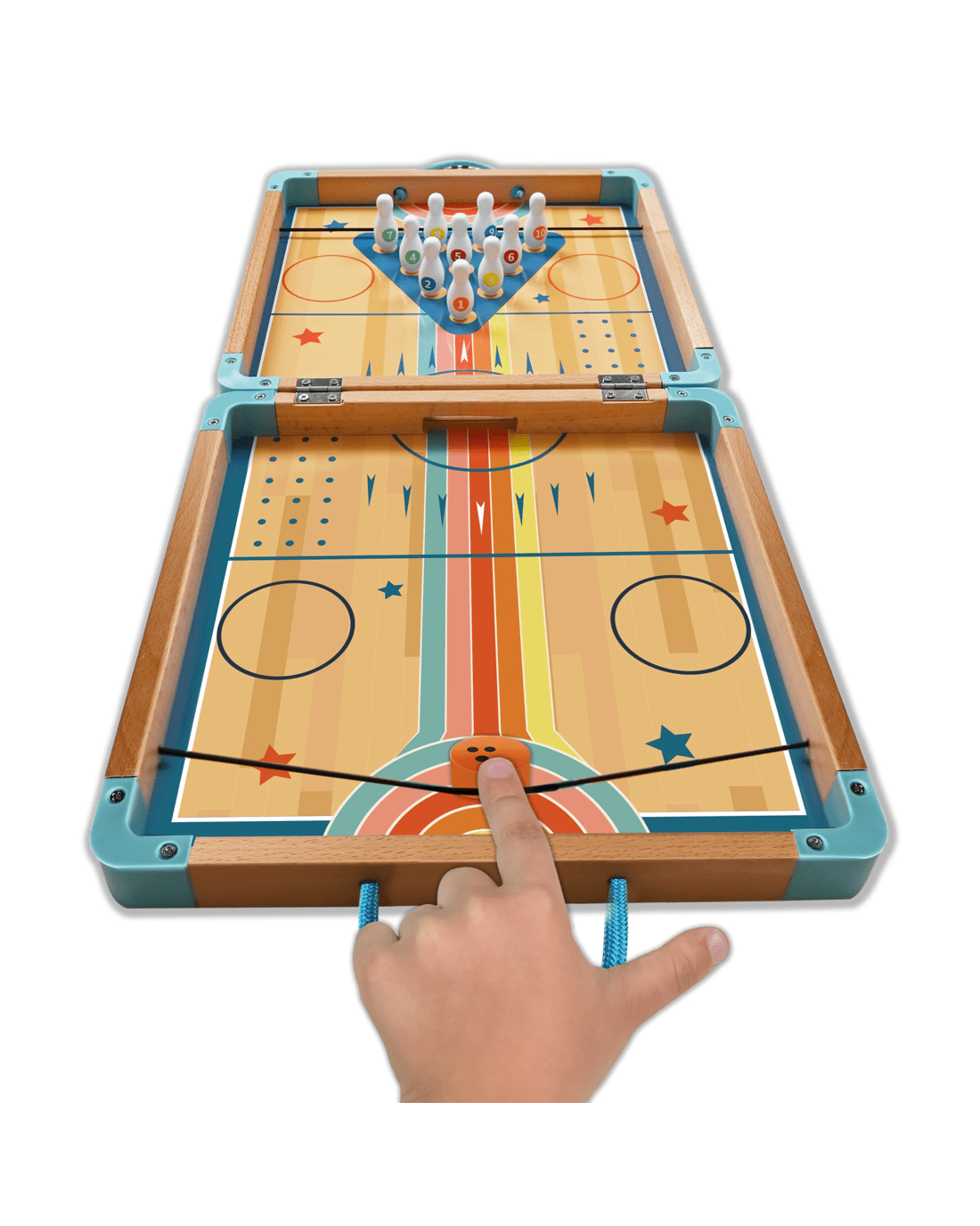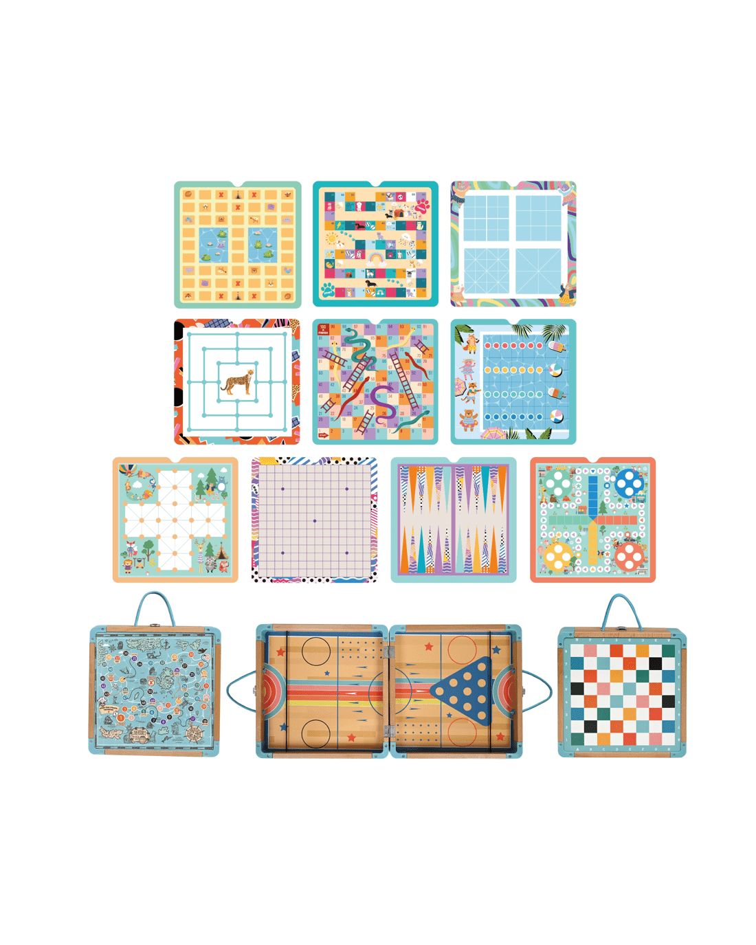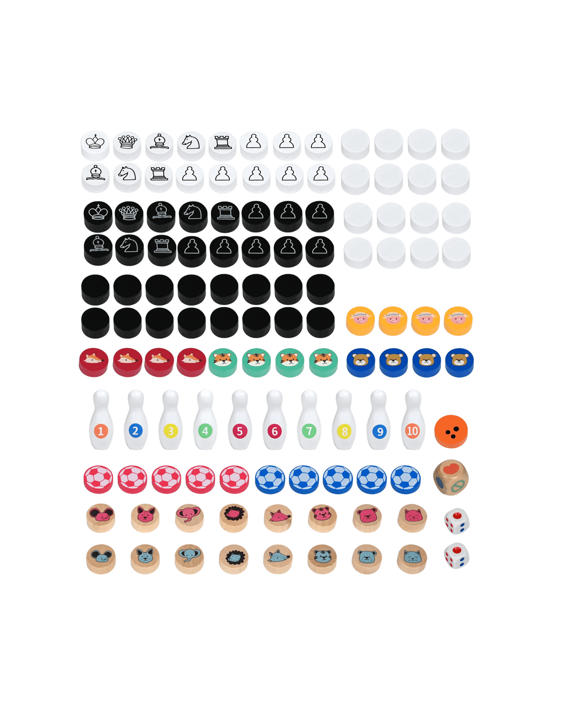 • Includes 10 x printed soccer pieces, 1 x bowling ball piece, 1 x wooden case, 5 x double size game boards, 16 x animal pieces, 1 x wooden dice, 32 x checker pieces, 32 x chess pieces, 16 x animal chess pieces, 2 x plastic dice and 10 x bowling pins