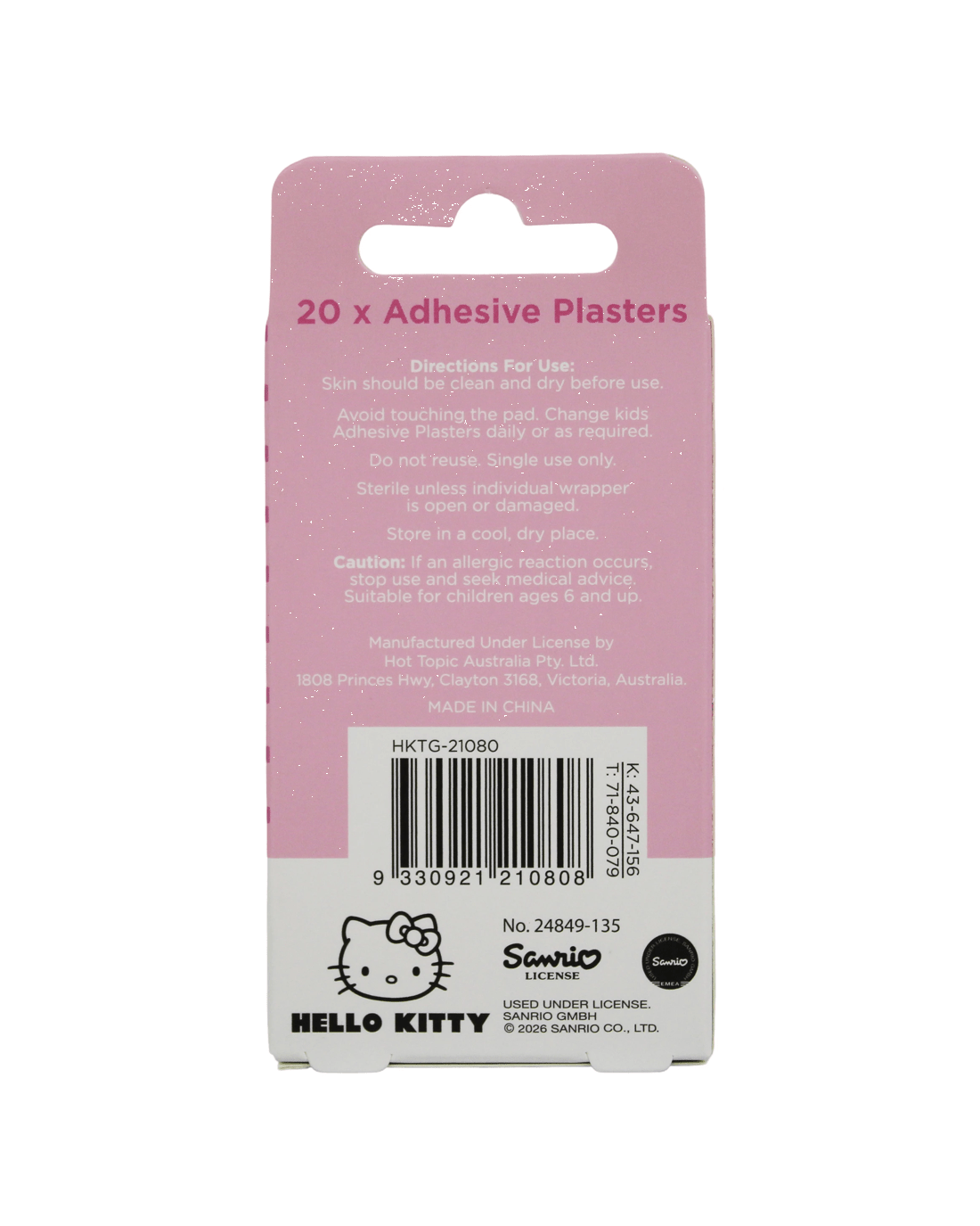 Add a touch of cuteness to everyday first aid with the 20 Pack Hello Kitty Adhesive Strips. Featuring adorable pink designs, these hypoallergenic, latex-free plasters are gentle on skin and breathable for comfortable, long-lasting wear. Perfect for little bumps and scrapes, they help protect wounds while bringing a smile to every brave moment.