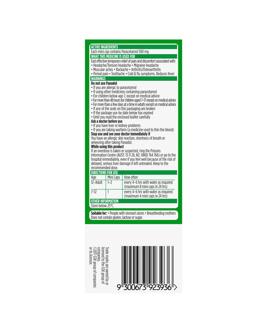 Panadol Mini Caps provide fast and effective relief of pain associated with: headache, tension headache, cold and flu symptoms, migraine headache, muscular aches, arthritis, osteoarthritis, backache and period pain. Panadol Mini Caps also reduce fever.