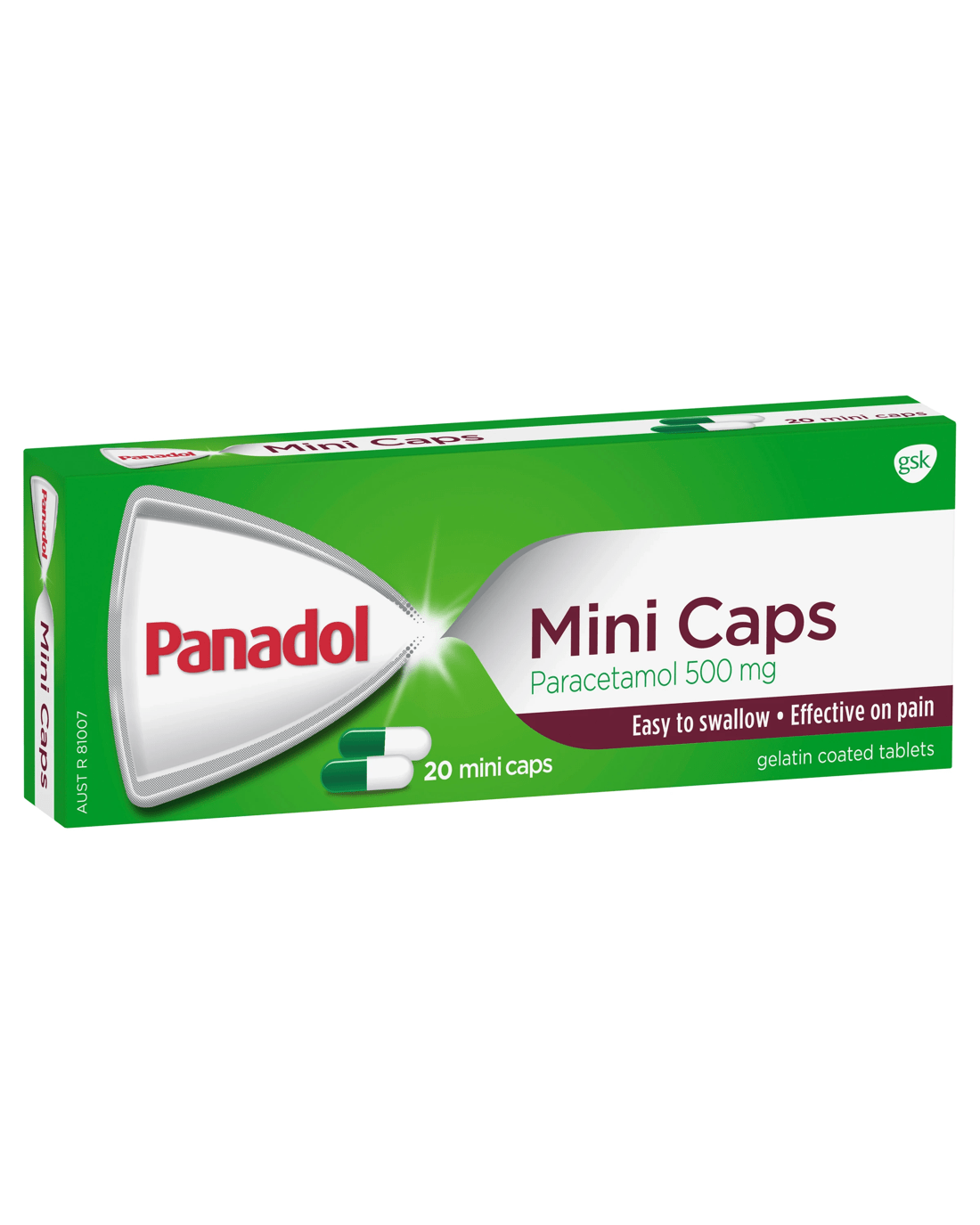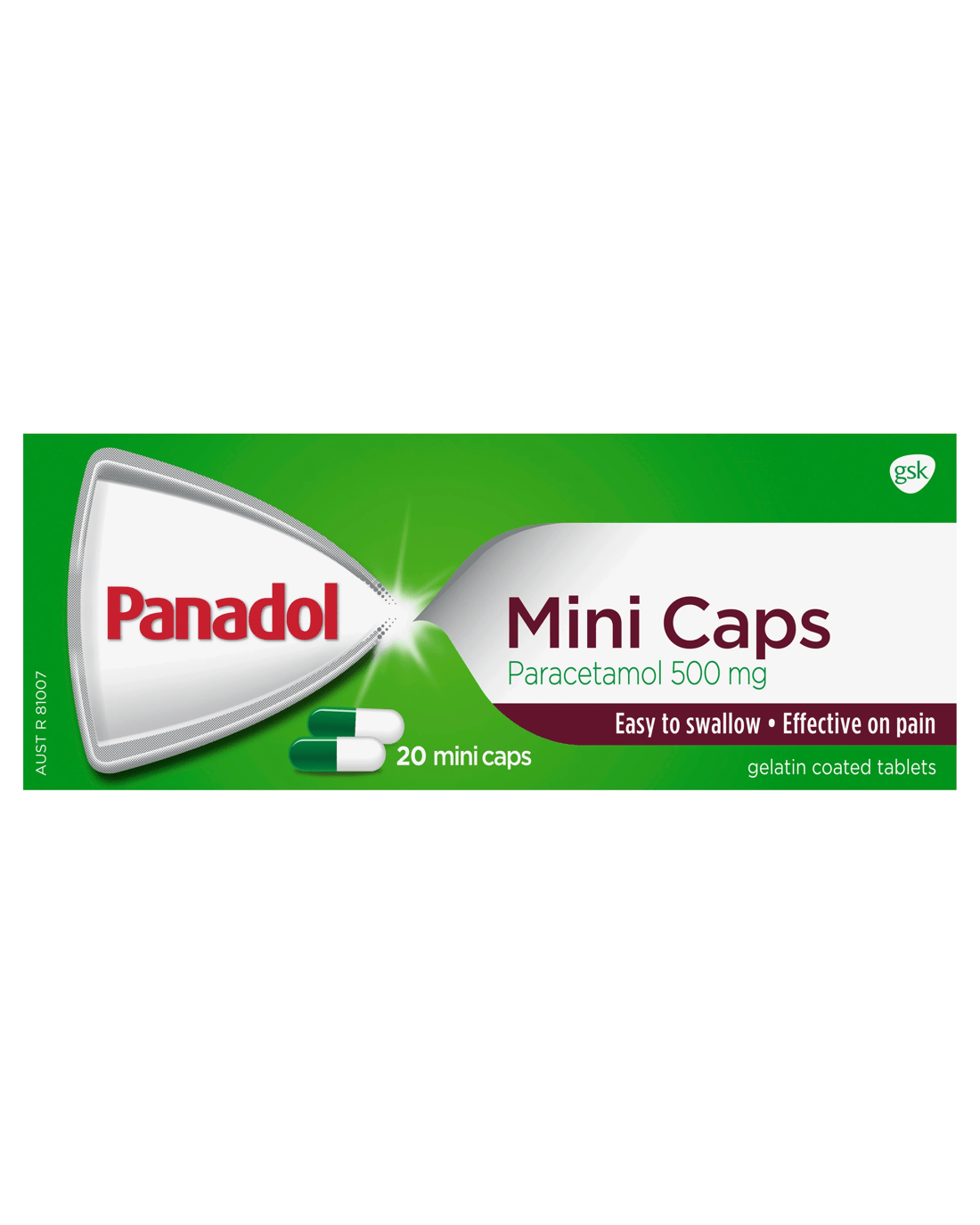 Panadol Mini Caps (for pain relief) are an easy-to-swallow, pain relief option. The small capsule-shaped tablets have a smooth gelatin coating for easy swallowing. Like other Panadol tablets and caplets, Panadol Mini Caps provide pain relief and are gentle on the stomach.