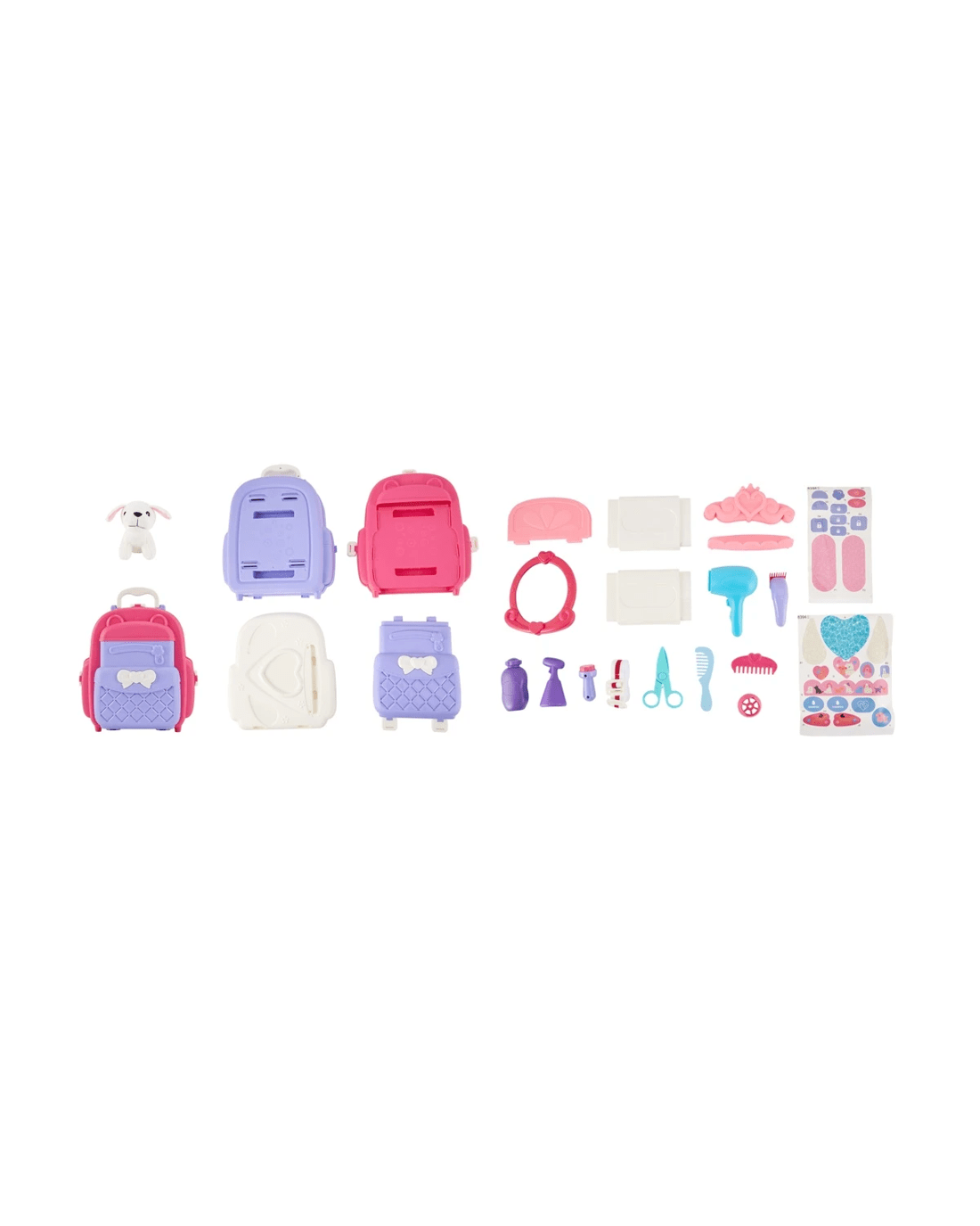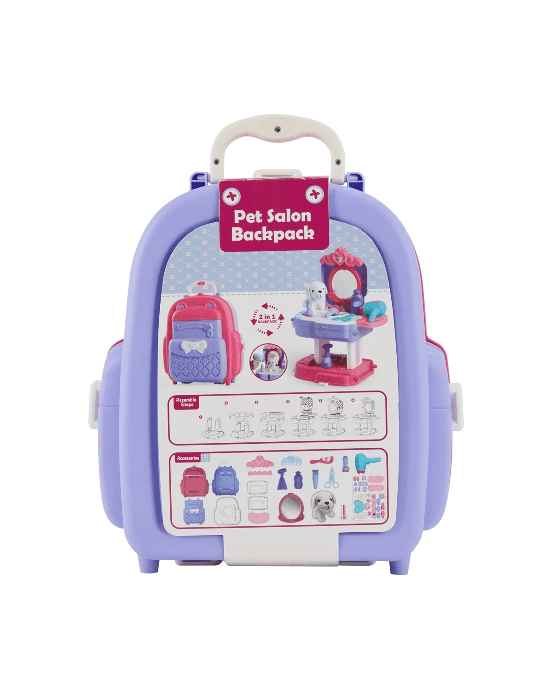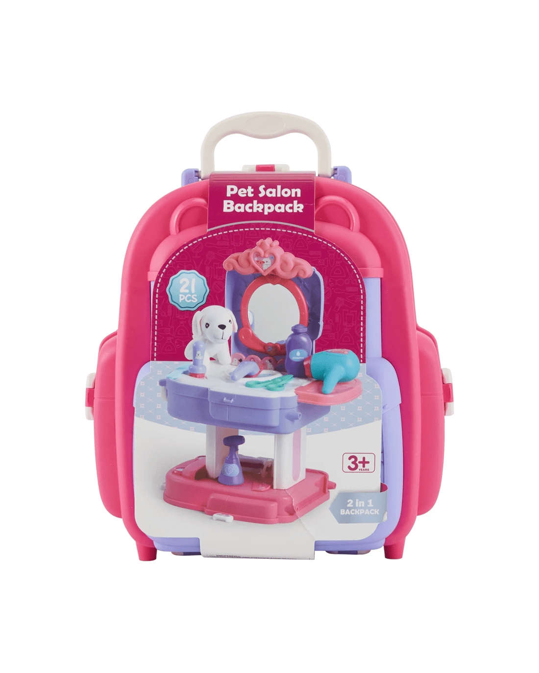 Little ones can style and play anywhere with the 21 Piece Pet Salon 2-in-1 Backpack Playset! This fun set opens into a full pet salon with grooming tools, cute pets and accessories. Carry, open and let the pet pampering begin!