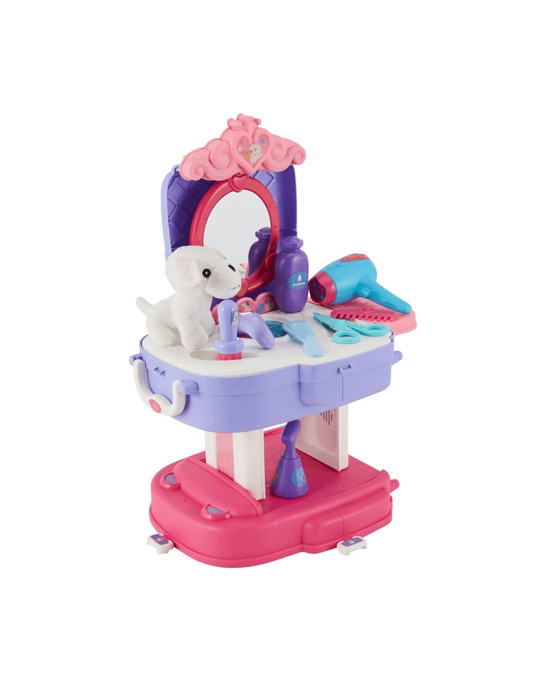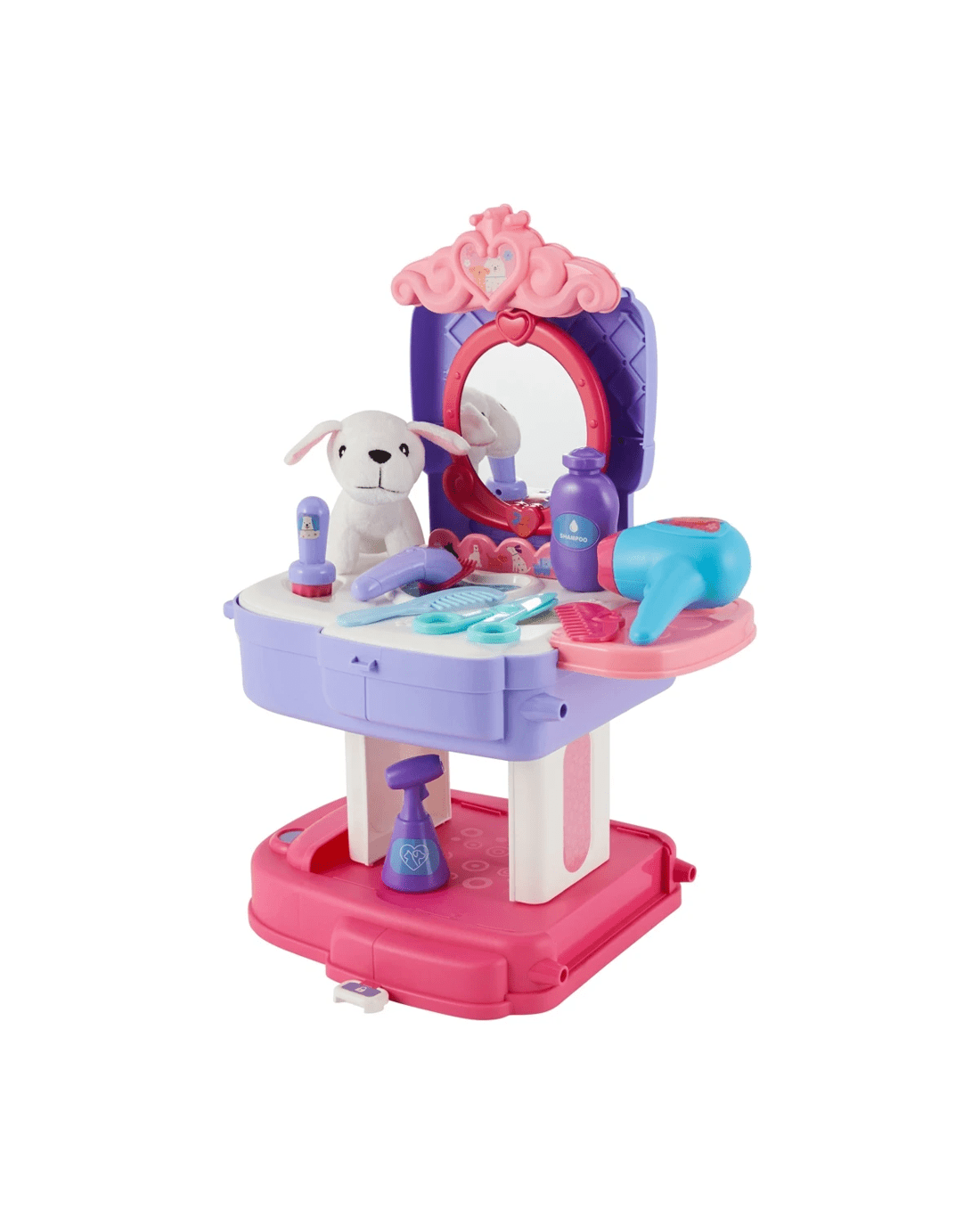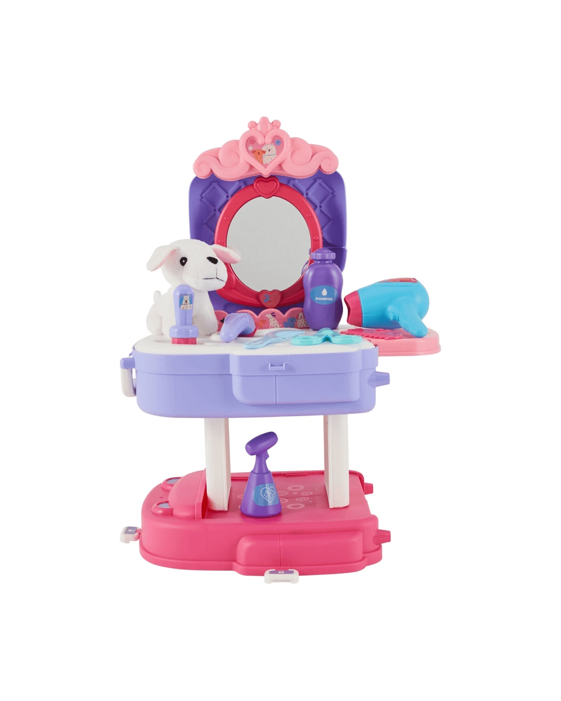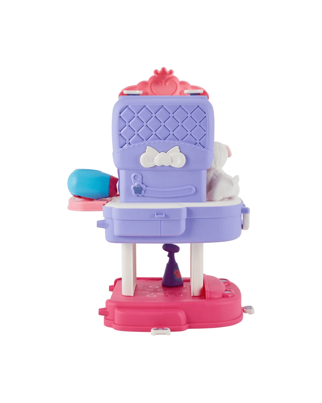 Little ones can style and play anywhere with the 21 Piece Pet Salon 2-in-1 Backpack Playset! This fun set opens into a full pet salon with grooming tools, cute pets and accessories. Carry, open and let the pet pampering begin!