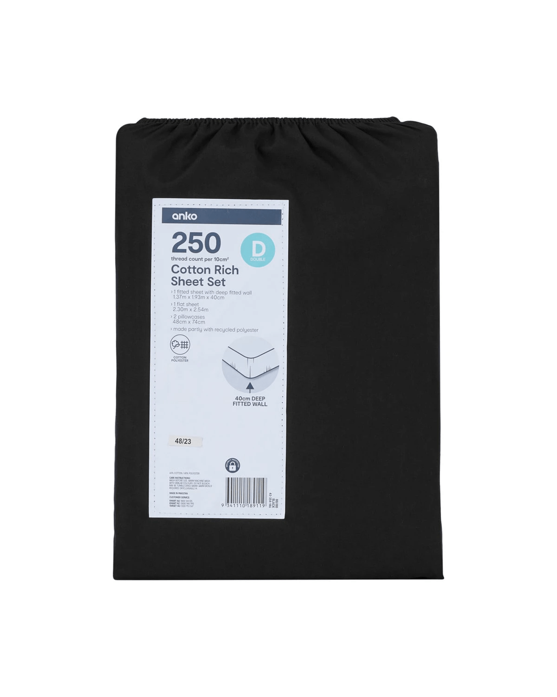 250 Thread Count Cotton Rich Sheet Set - Double Bed, Black
