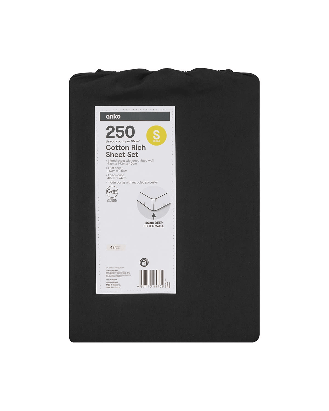 250 Thread Count Cotton Rich Sheet Set - Single Bed, Black