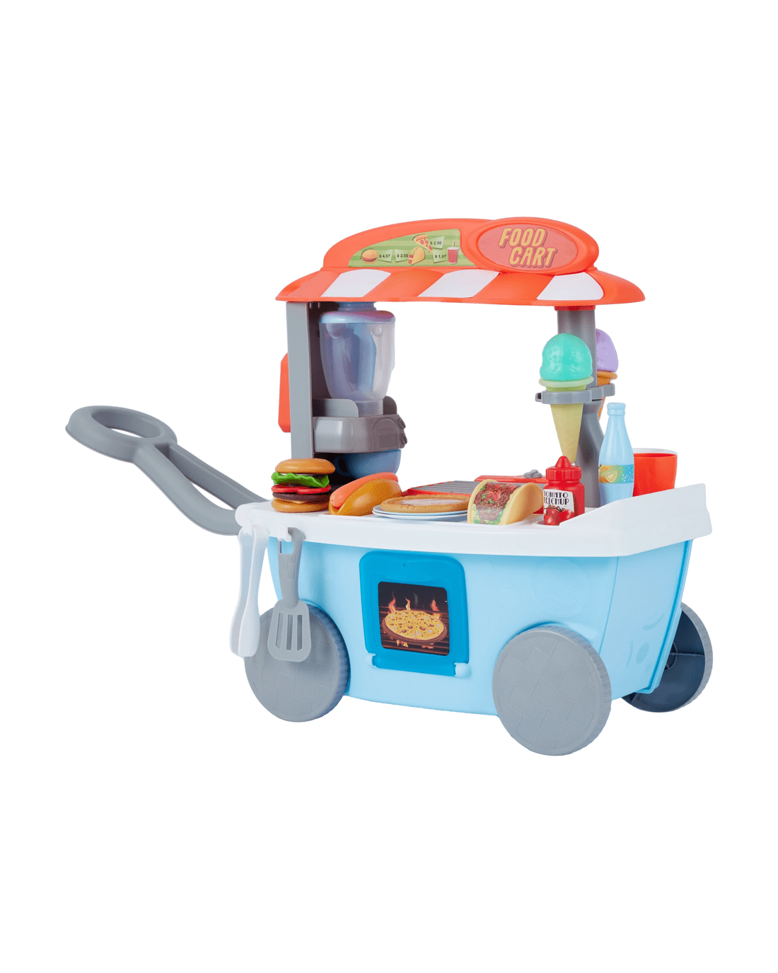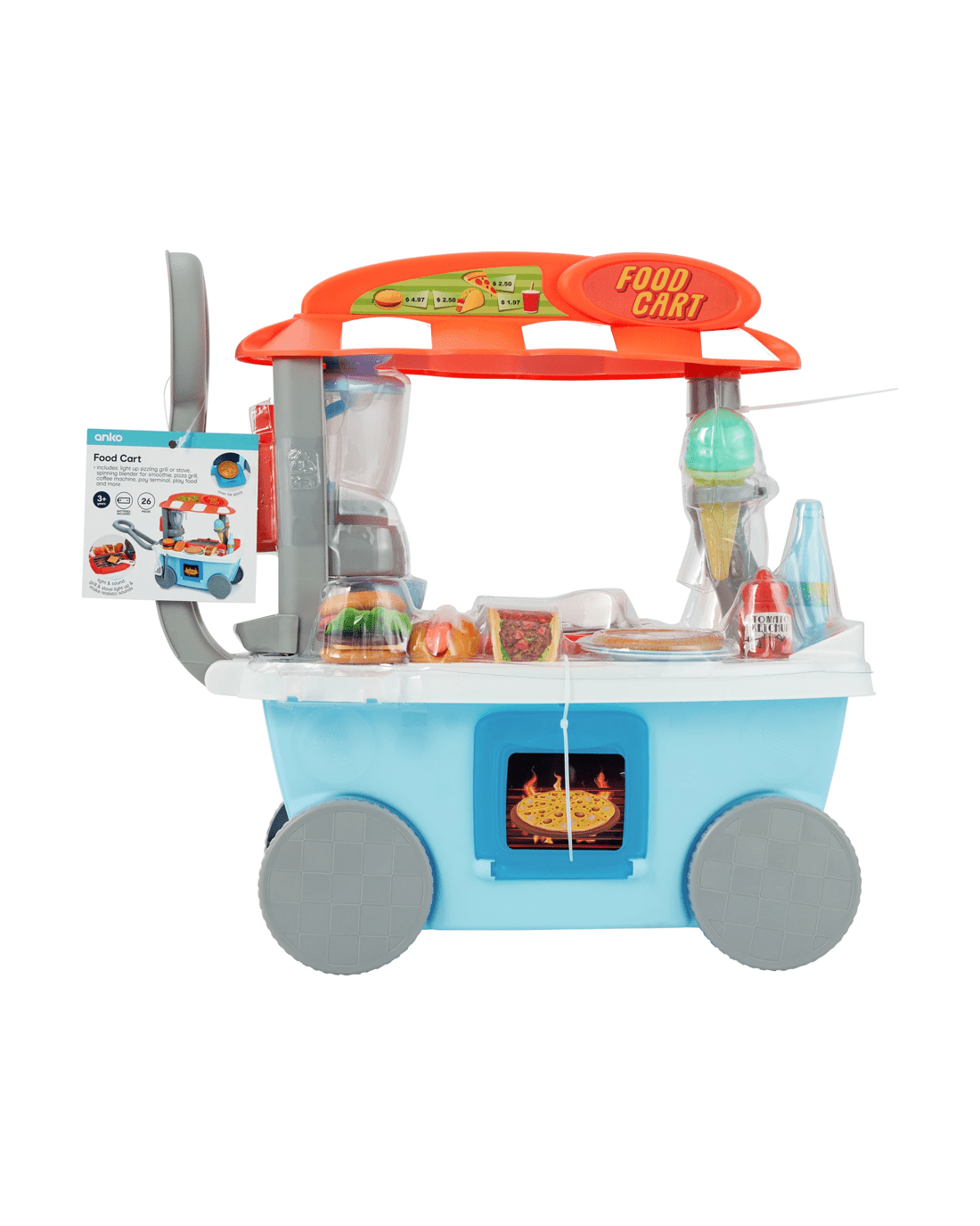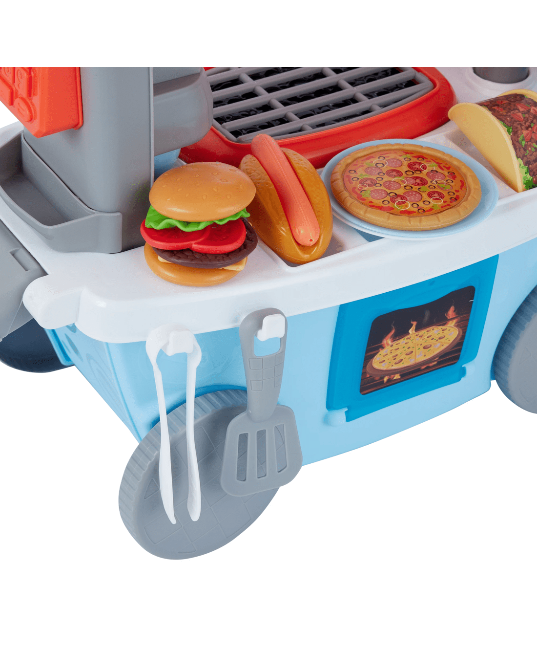 - Includes 1 x light-up sizzling grill or stove, 1 x spinning blender for smoothies, 1 x pizza grill, 1 x coffee machine, 1 x pay terminal, play food and more