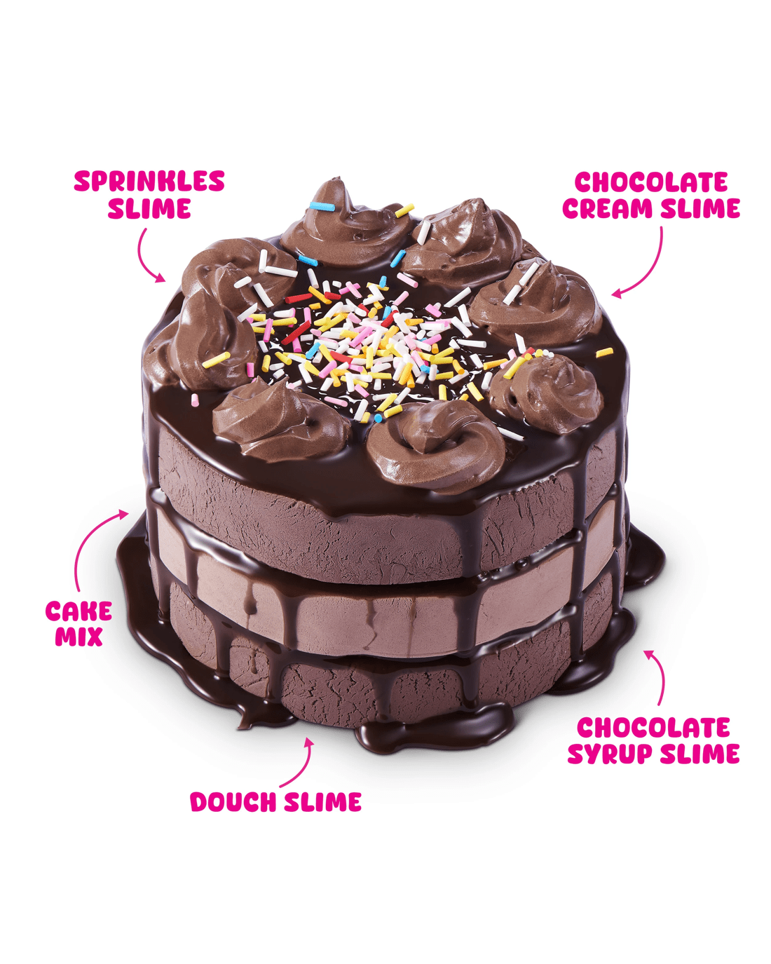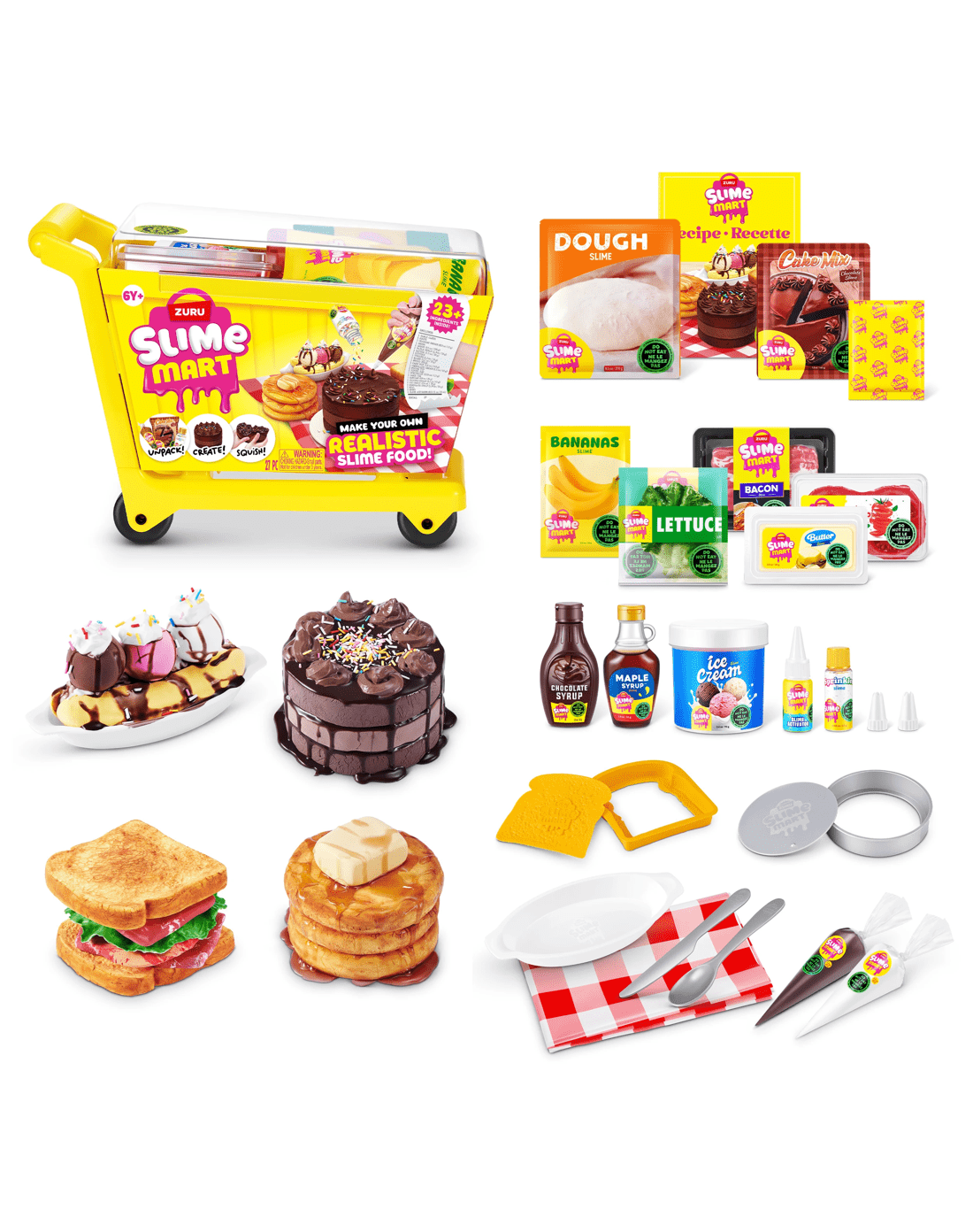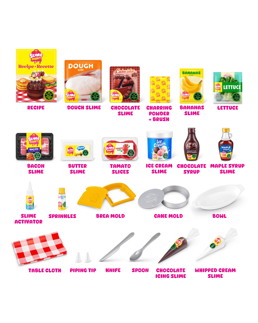 • Includes 1 x slime mart trolley, 1 x table cloth, 1 x slime activator, 1 x knife, 2 x dough, 1 x charring powder, 1 x brush, 1 x maple syrup slime, 1 x butter slime, 1 x bread mold, 1 x bacon pack slime, 1 x plastic lettuce, 1 x tomato pack slime, 1 x cake mix, 1 x icing (cream) slime, 1 x piping tip, 1 x sprinkles, 1 x cake tin, 1 x banana slime, 1 x whipped cream slime, 3 x ice cream slime, 1 x chocolate syrup slime, 1 x bowl and spoon set