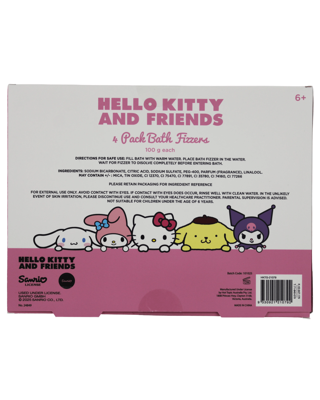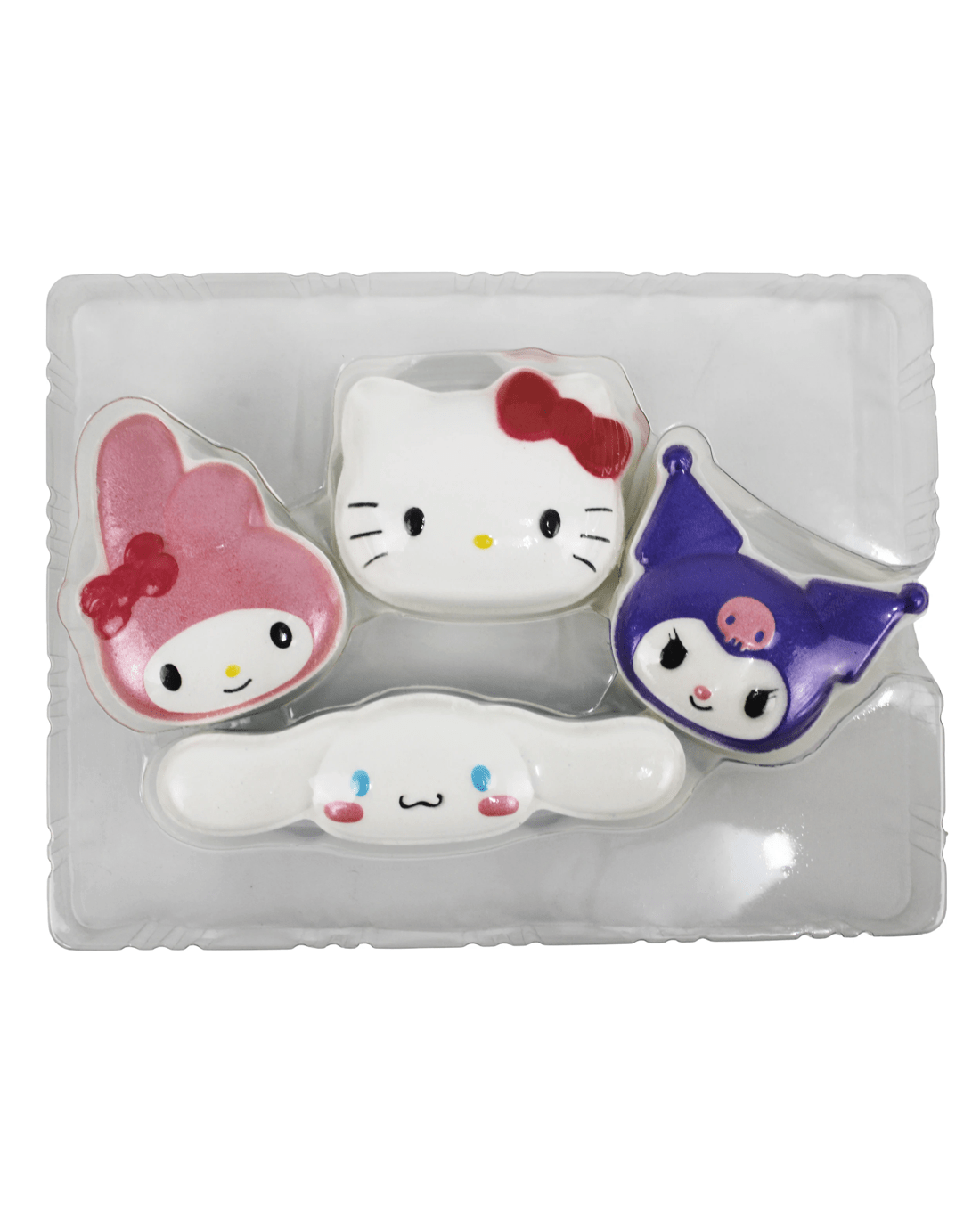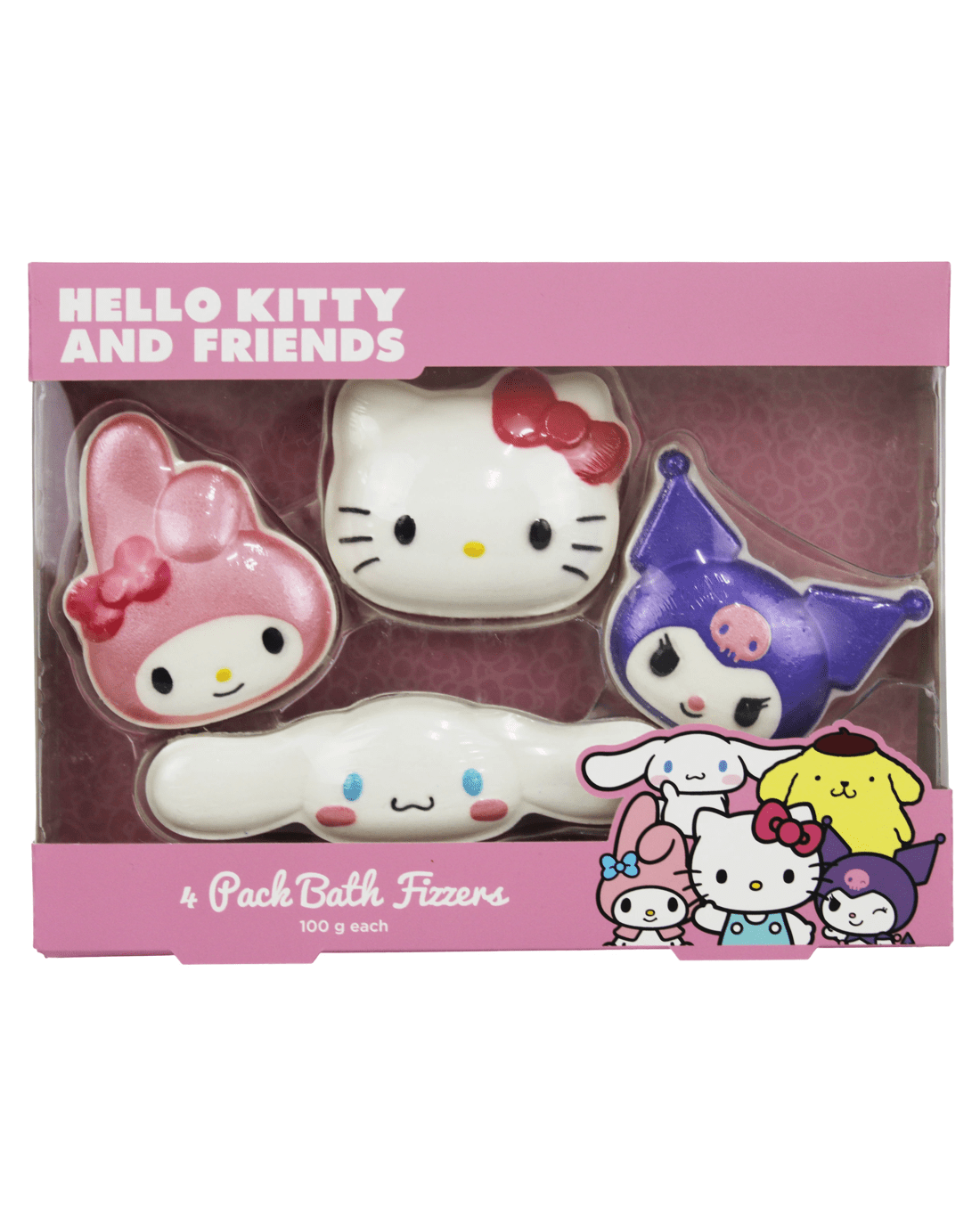 Make bath time extra adorable with the Hello Kitty & Friends Bath Fizzers 4 Pack, featuring Hello Kitty, Kuromi, My Melody, and Cinnamoroll. Each fizzer releases a soft fragrance and a hint of colour as it dissolves, turning your bath into a fun and relaxing experience. With its cute character designs and colourful packaging, this set makes the perfect gift or self-care treat for any Sanrio fan.