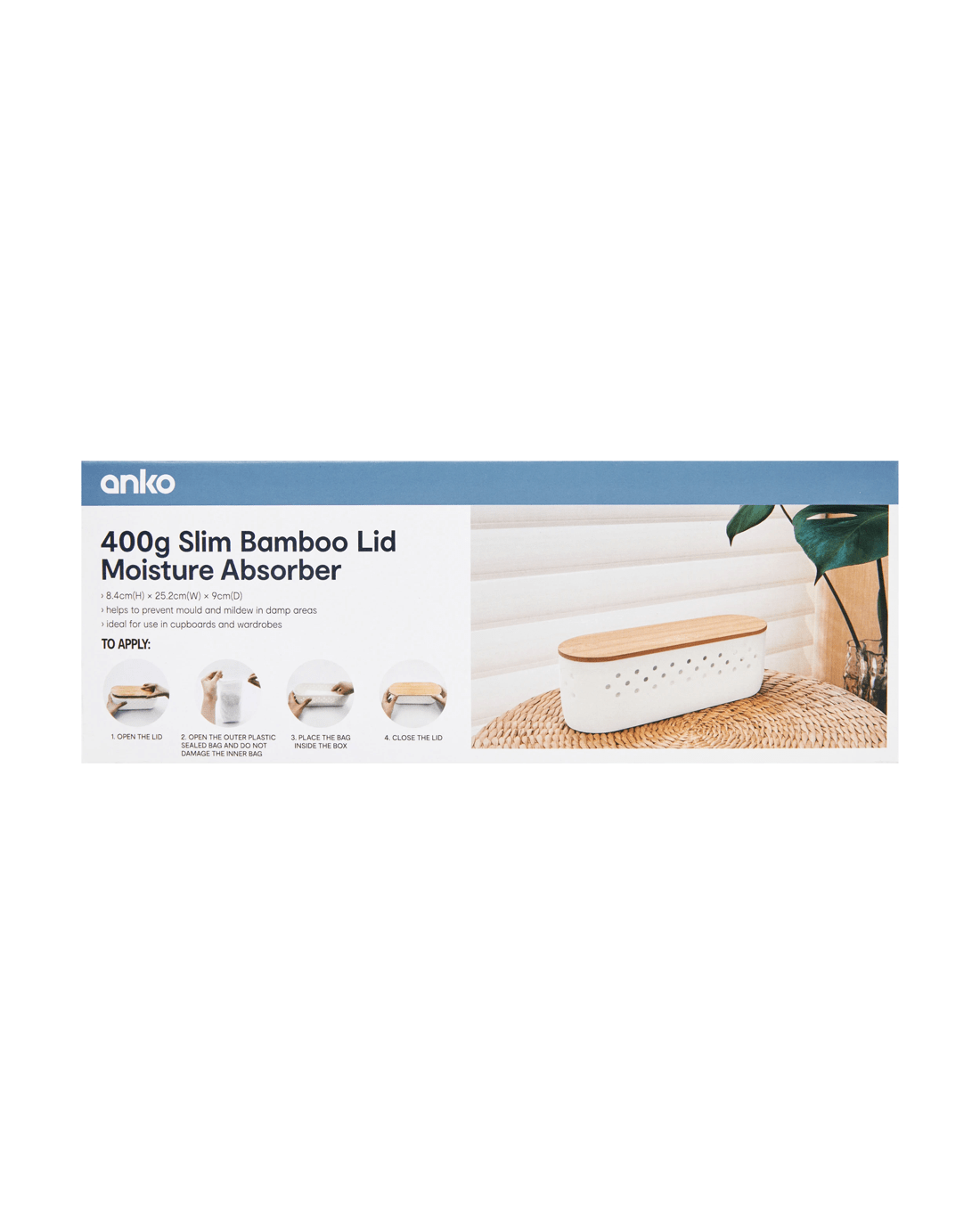 Place the 400g Bamboo Lid Slim Moisture Absorber in compact areas to help manage dampness - a neat option for wardrobes, shelves or storage spots.