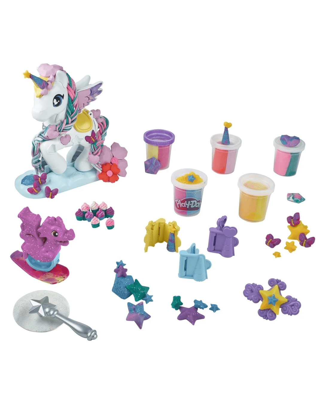 - Custom unicorn horns: Add Play-Doh compound to grow the unicorn's mane and tail, then customise her style with three different horn moulds. Use the built-in jewel moulds for even more fantasy dress-up fun