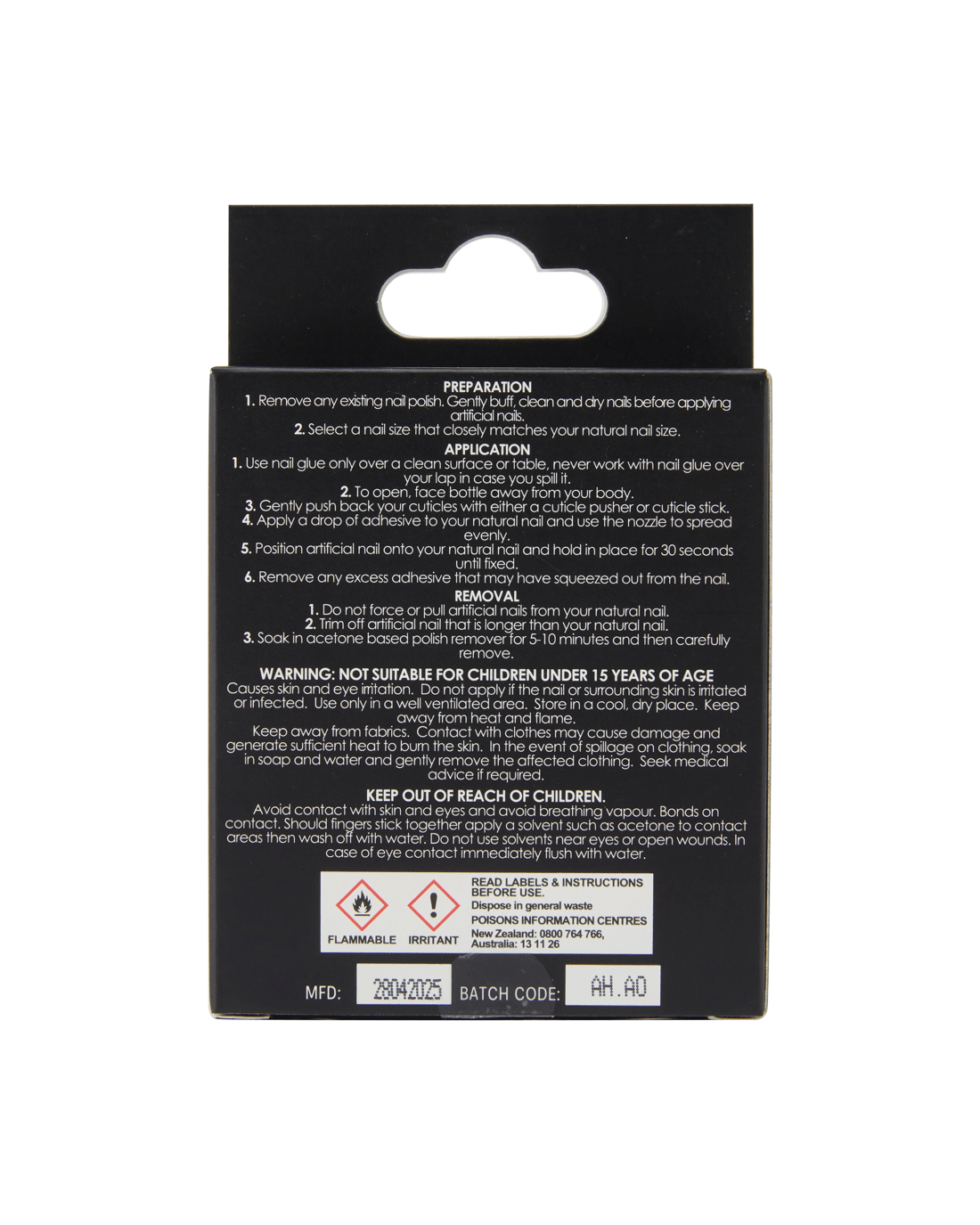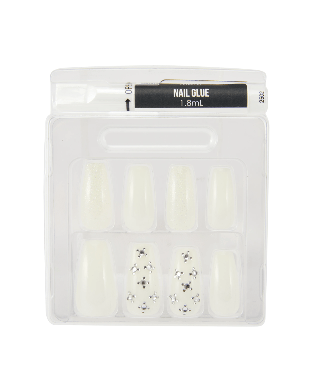 - Nail glue: Ethyl Cyanoacrylate, Polymethyl Methacrylate, Tris-BHT Mesitylene, Acetyl Tributyl Citrate, Tocopherol and Panthenol