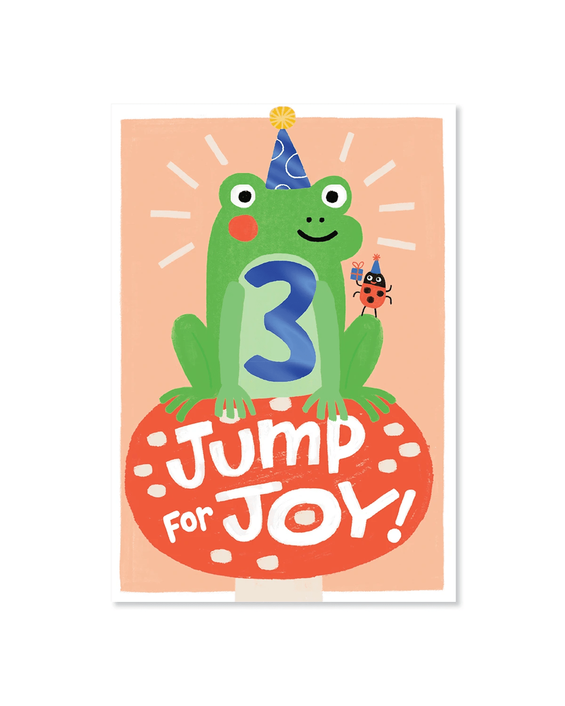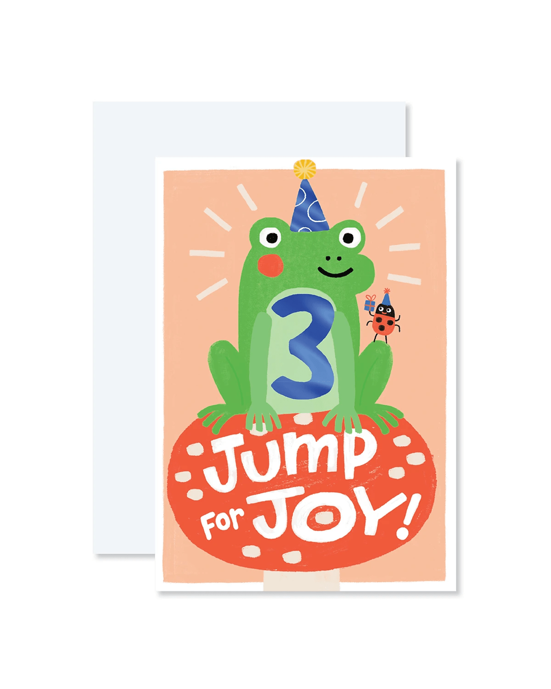 • Front of card features blue foil detailing, the number 3 and an illustration of a frog with the message 'Jump for Joy!'