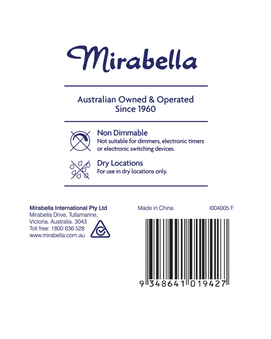 Warning: When inserting or replacing globes, ensure the power is off. Do not use excessive force and check light fitting suitability before use. Not suitable for dimmers.