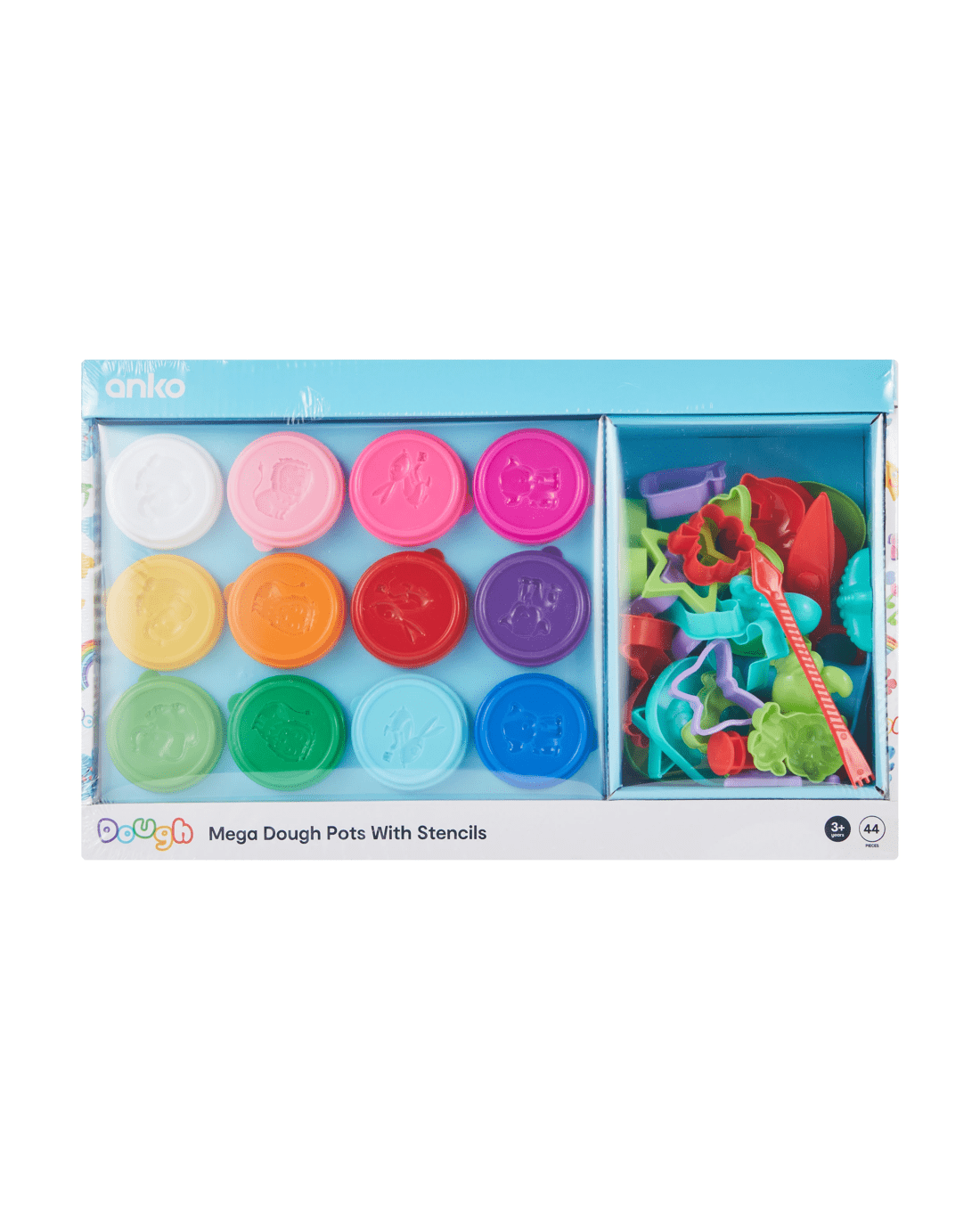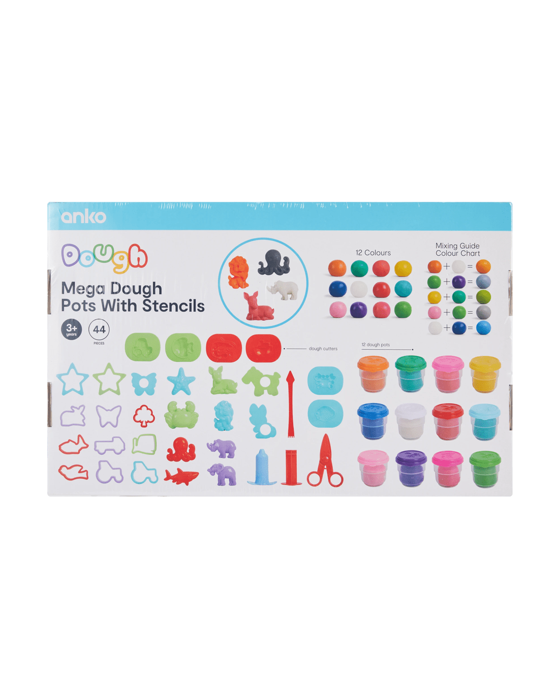 - Includes 4 x dough cutters, 12 x colour dough pots and mixing guide colour chart