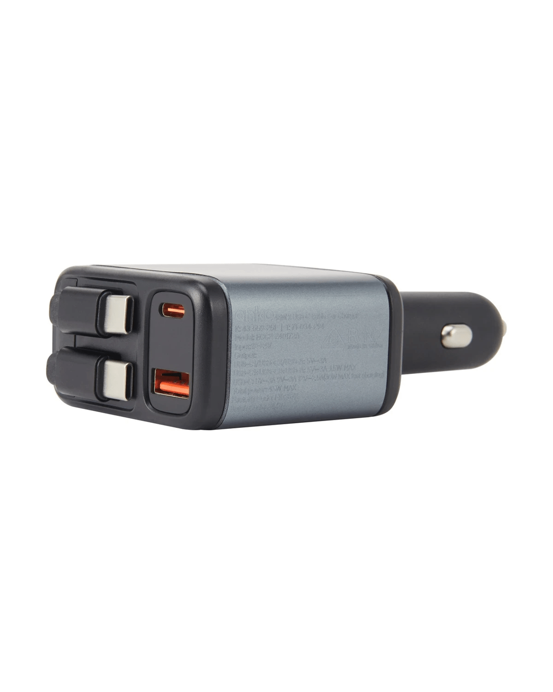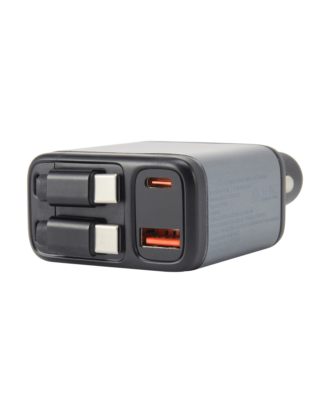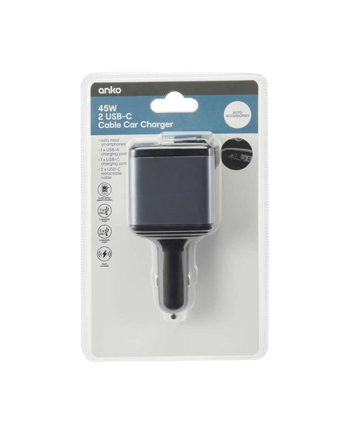 Power up on the go with the 45W Dual USB-C Cable Car Charger. Designed for fast, efficient charging, it features two USB-C ports and an included cable, perfect for keeping devices charged during commutes, road trips, or everyday travel.