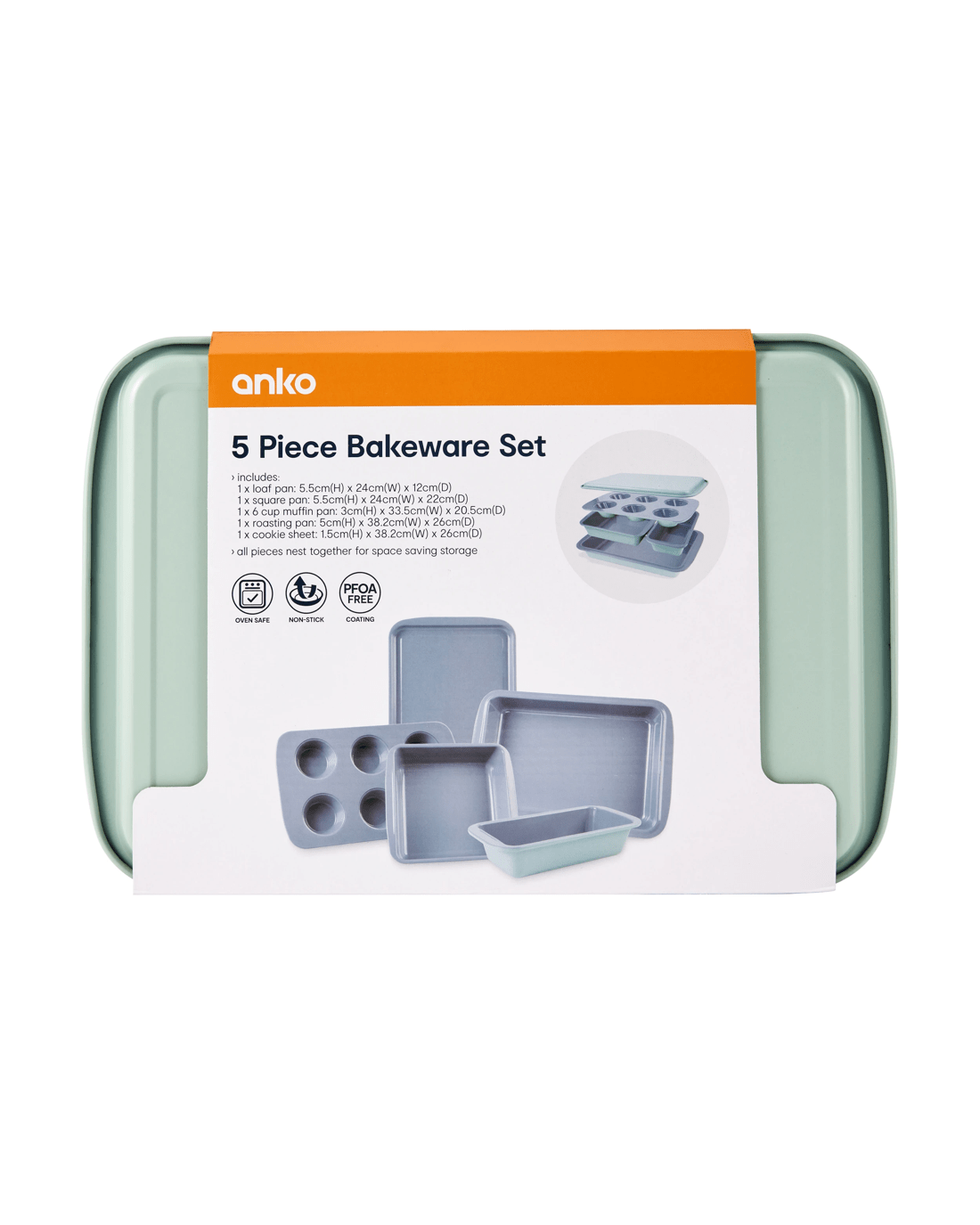 - Includes 1 x loaf pan, 1 x square pan, 1 x 6 cup muffin pan, 1 x roasting pan and 1 x cookie sheet
