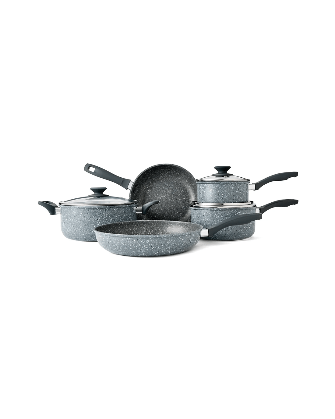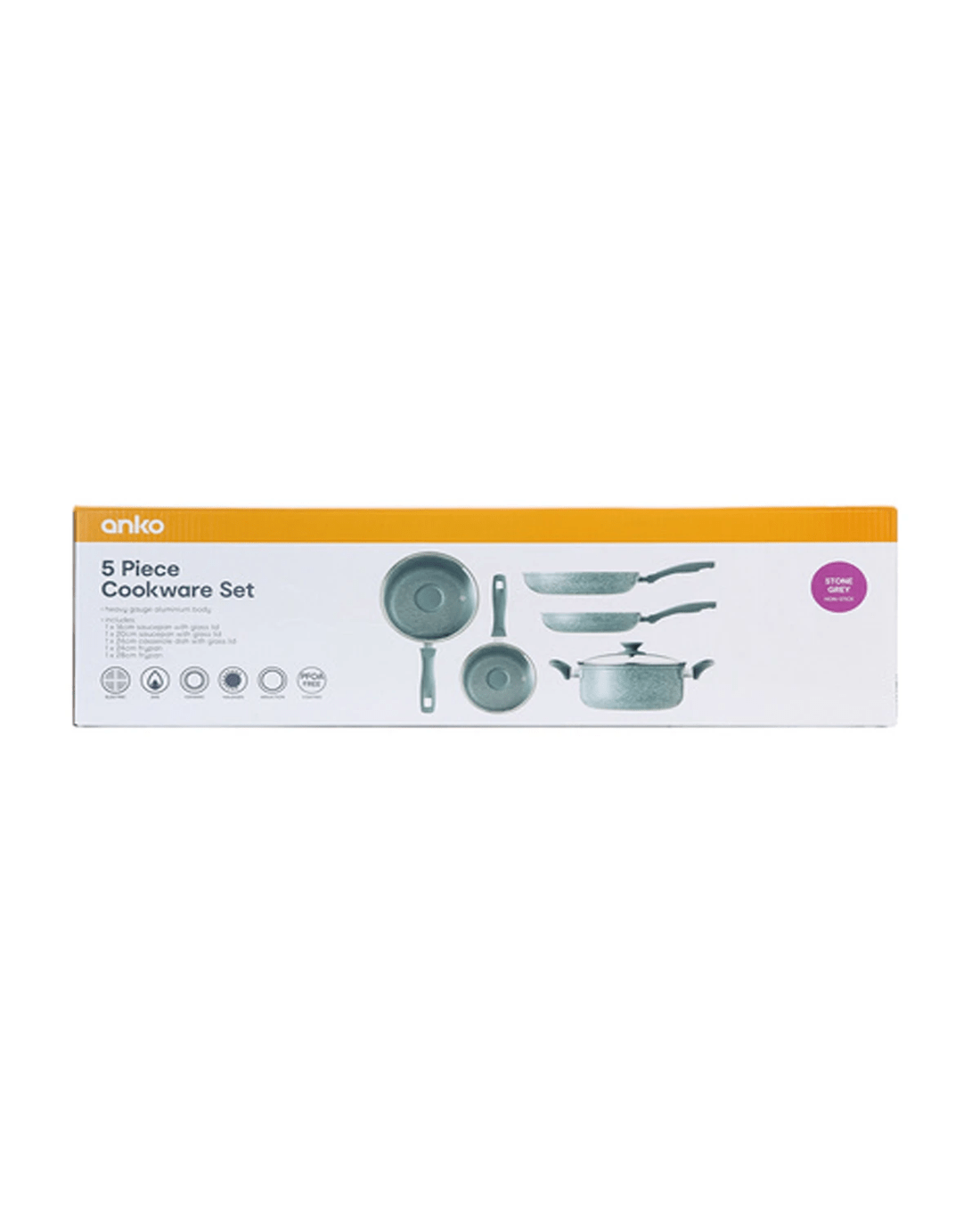 5 Piece Cookware Set Specifications- Includes 1 x 24cm frypan, 1 x 28cm frypan, 1 x 16cm saucepan with glass lid, 1 x 20cm saucepan with glass lid and 1 x 24cm casserole with glass lid