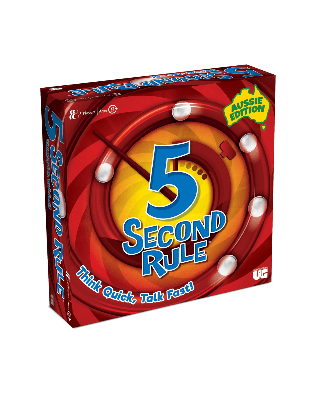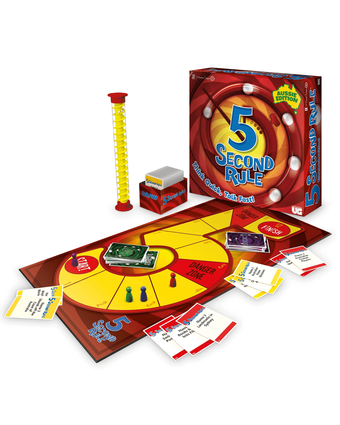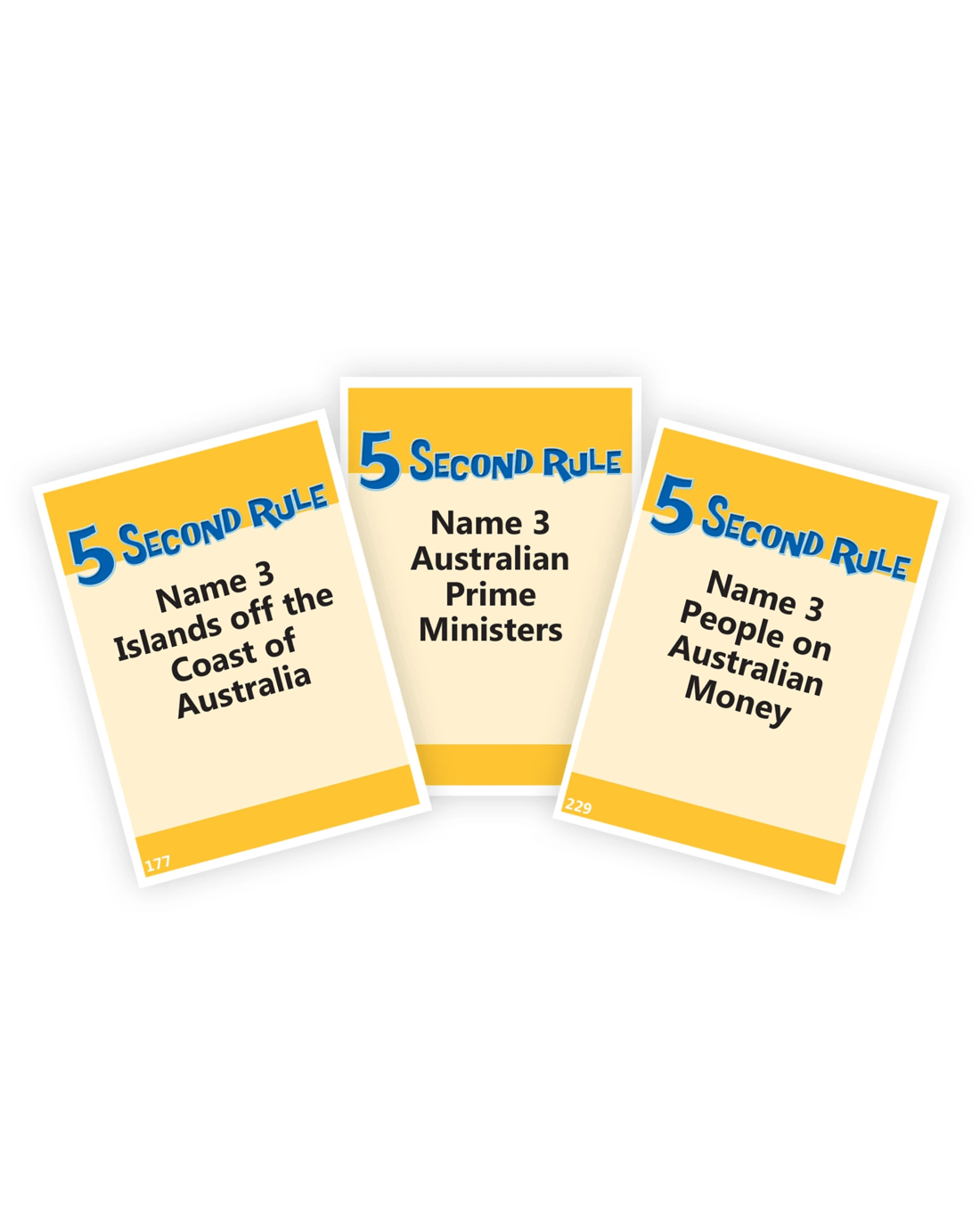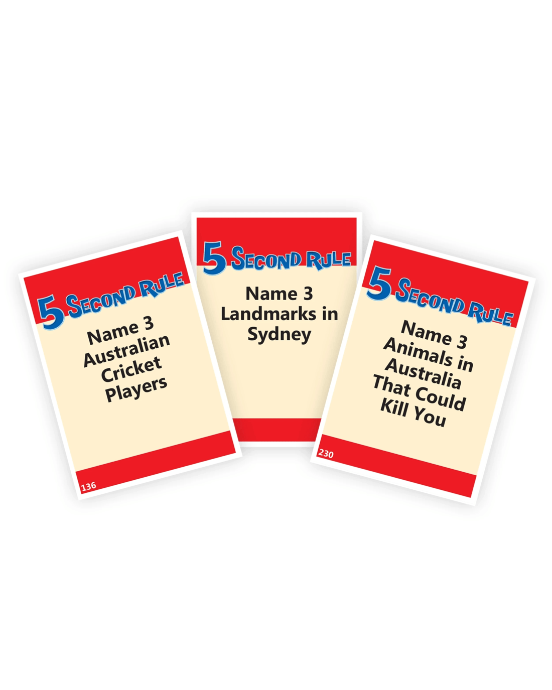 Pick a card, read the seemingly easy topic, then start the timer! Now with only five seconds to name three things that fit the topic, it doesn’t seem so easy! Can you name three Australian Olympians? Players get tongue-tied, funny answers come flying out and laughter is sure to follow in this fast-paced party game. The twisted timer makes a fun zoooooop! Featuring general and Australian content.