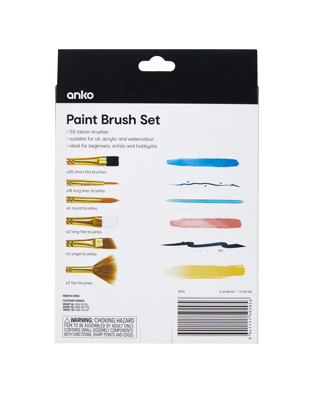 Product Details- Includes 20 x short flat brushes, 18 x long liner brushes, 6 x round brushes, 2 x long flat brushes, 2 x angel brushes and 2 x fan brushes