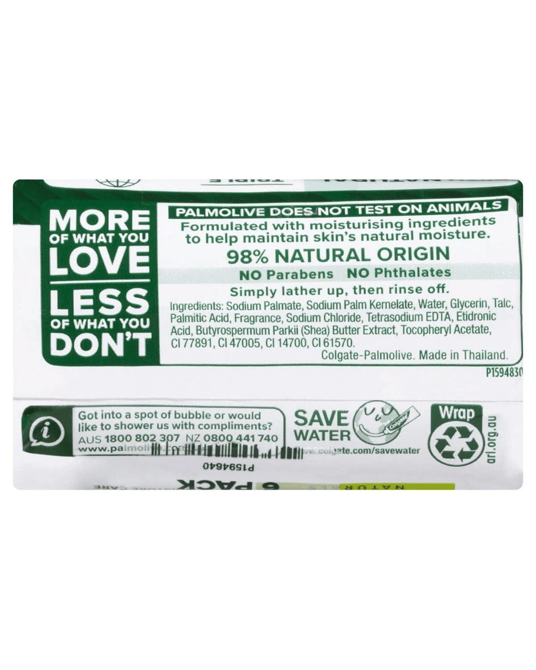 • Ingredients: Sodium Palmate, Sodium Palm Kernelate, Water, Glycerin, Palmitic Acid, Fragrance, Butyrospermum Parkii (Shea Butter) Extract, Tocopheryl Acetate, Titanium Dioxide, CI 47005, CI 14700 and CI 61570