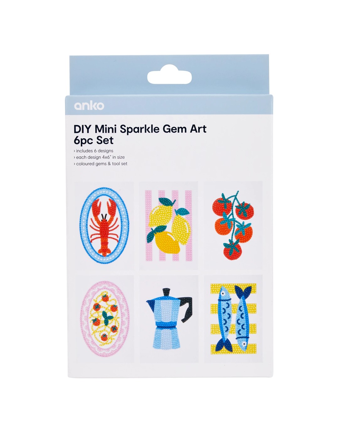 • Includes 6 x designs, coloured gems and tool set