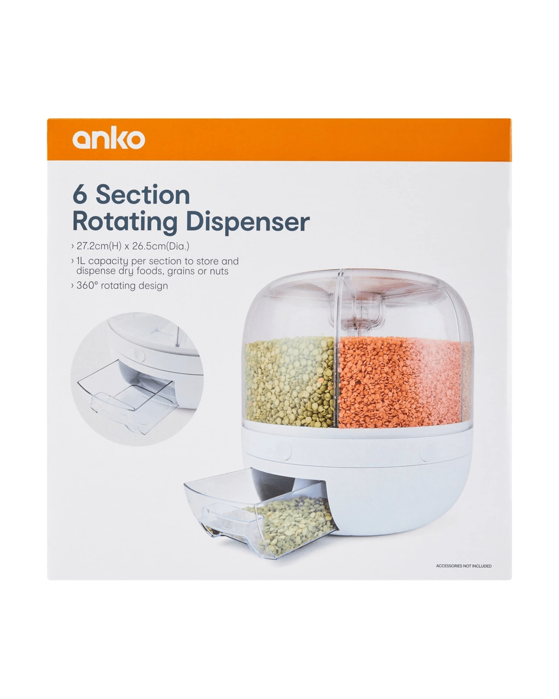 The 6 Section Rotating Dispenser is a convenient storage solution for dry foods, offering an organised and accessible way to manage everyday pantry staples at home.