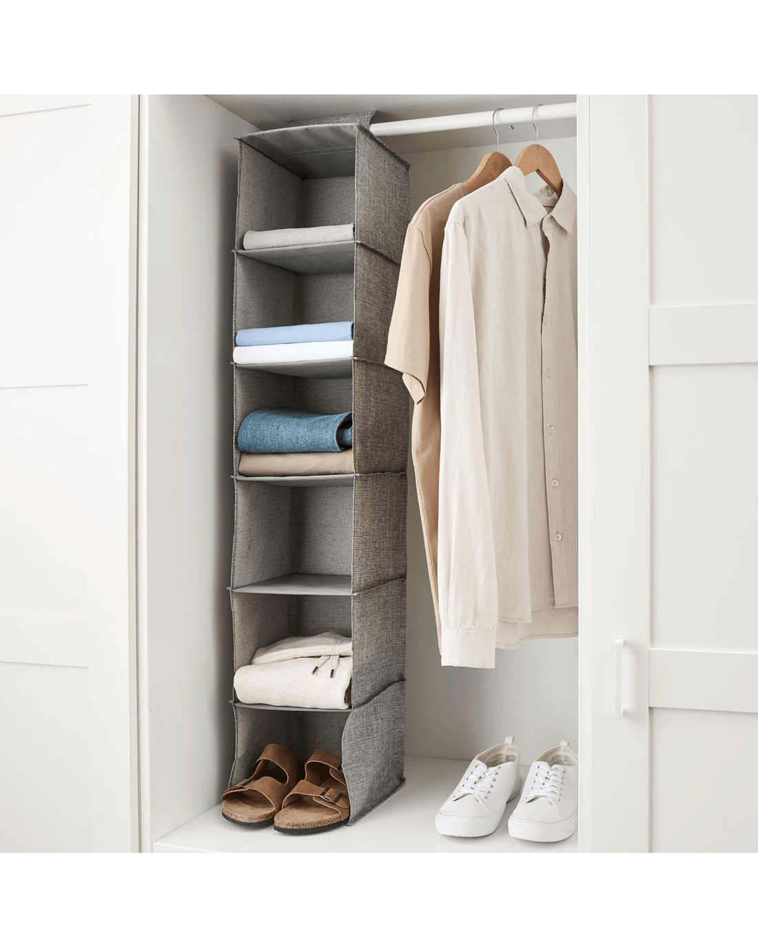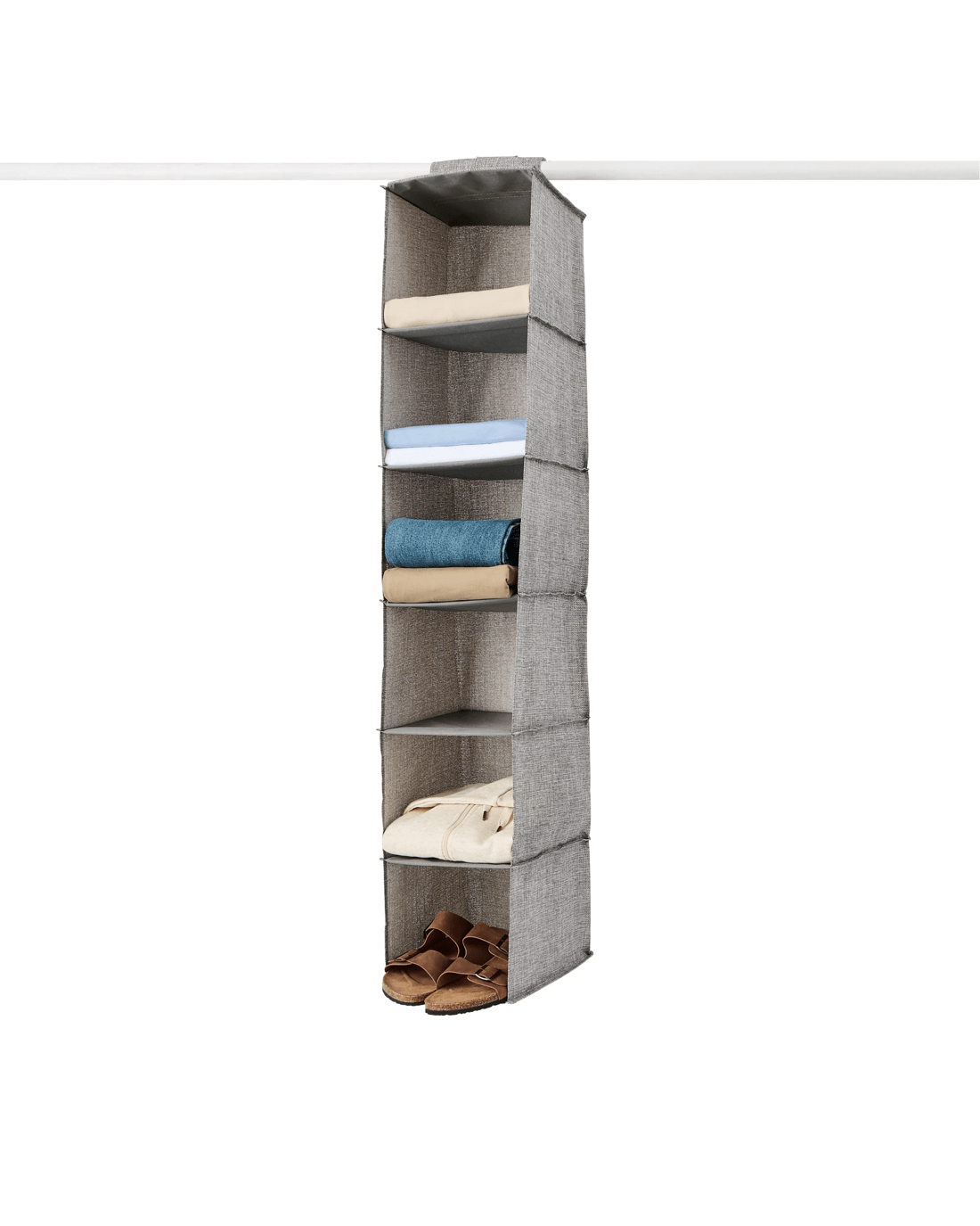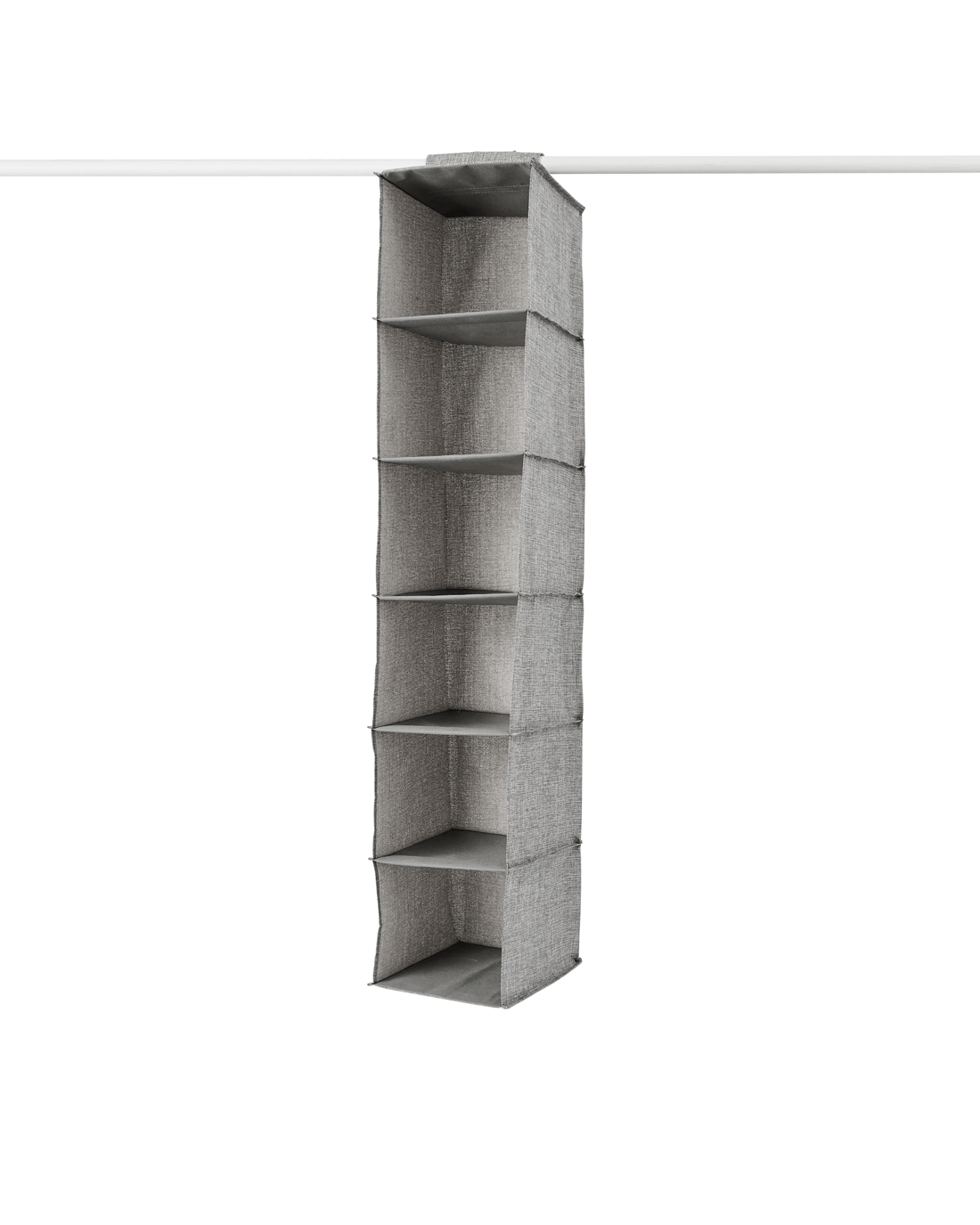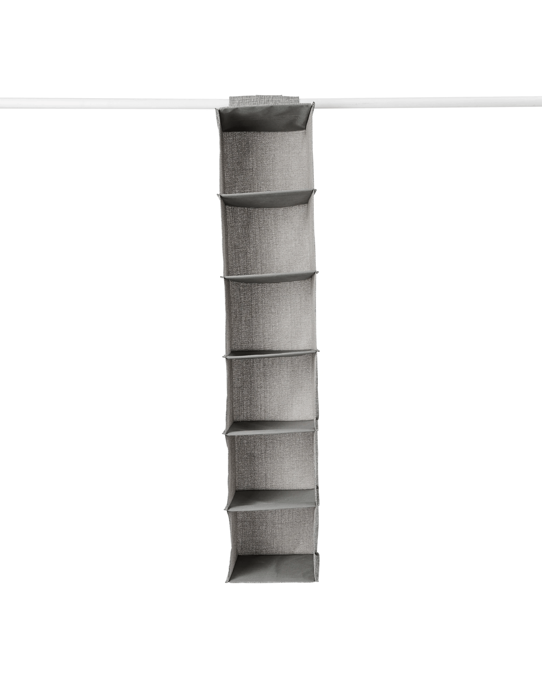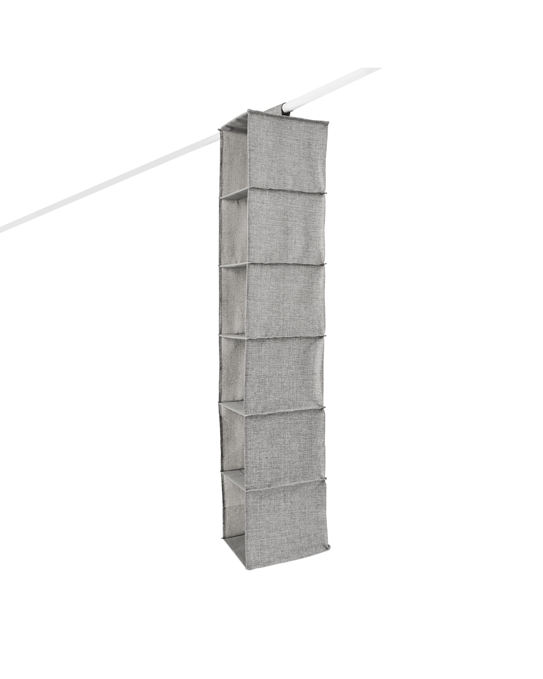 Optimise your wardrobe space with this 6 Shelf Linen Look Hanging Organiser, perfect for arranging and organising your clothes.