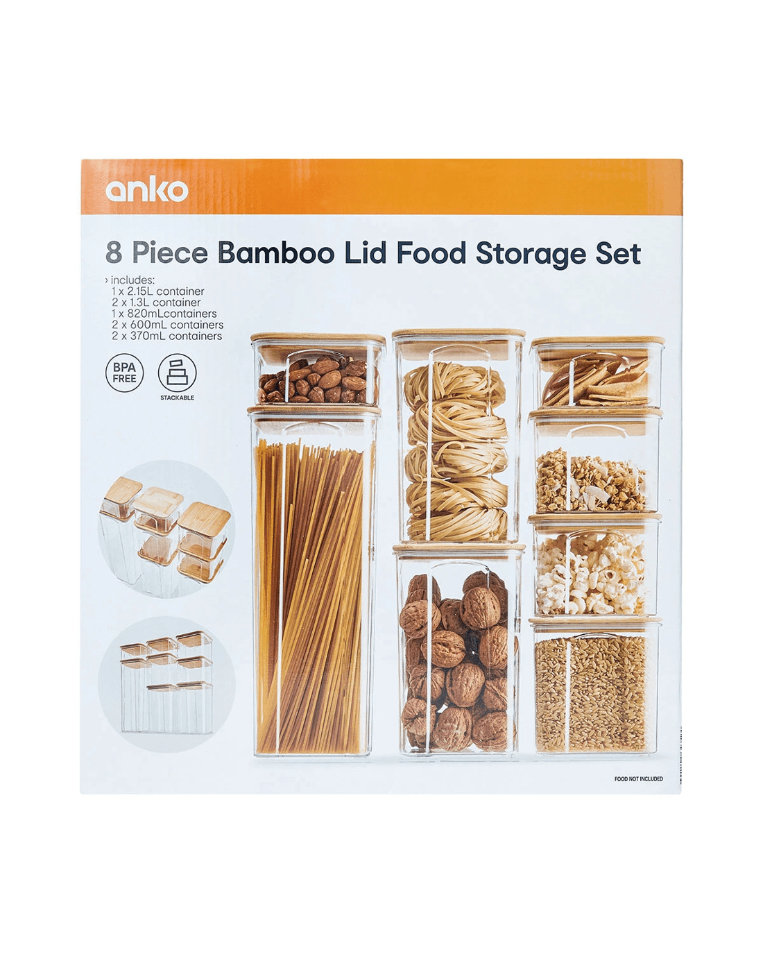 8 Piece Bamboo Lid Food Storage Set Specifications- Includes 1 x 2 litre container, 1 x 1.3 litre container, 2 x 820ml containers, 2 x 600ml containers and 2 x 370ml containers