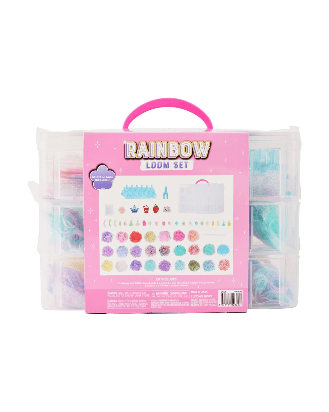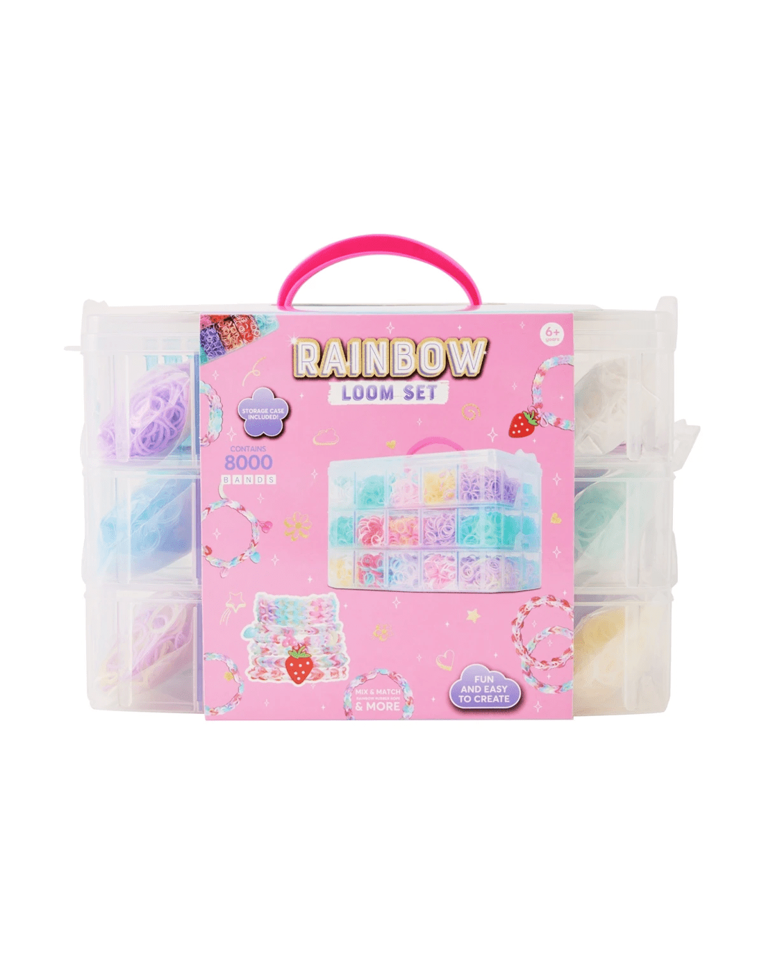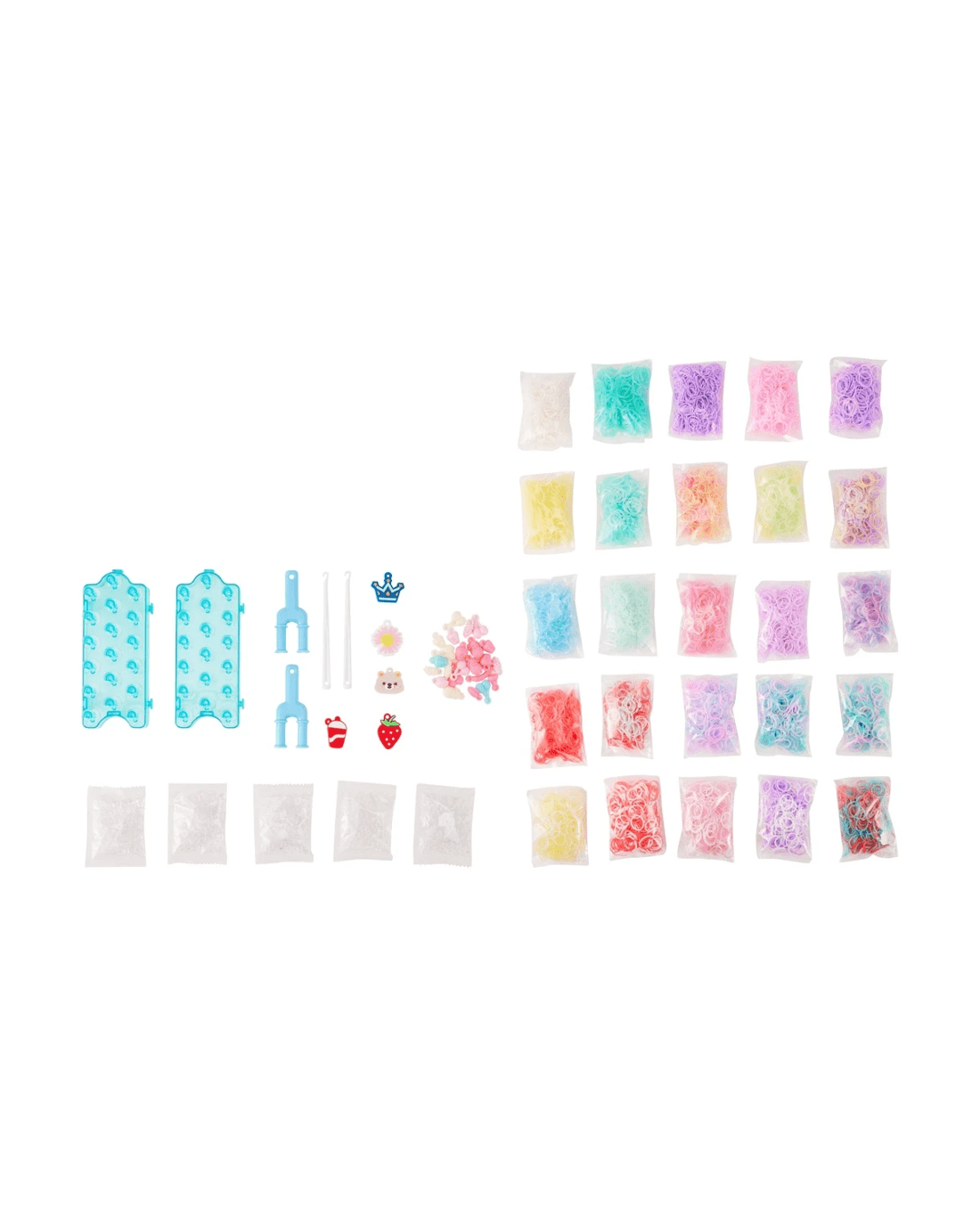 - Includes 1 x storage box, 8000 x loom bands, 2 x looms, 5 x bag of S-clips, 1 x bag of fruit pendants, 2 x hooks, 2 x Y looms and 1 x bag of charms