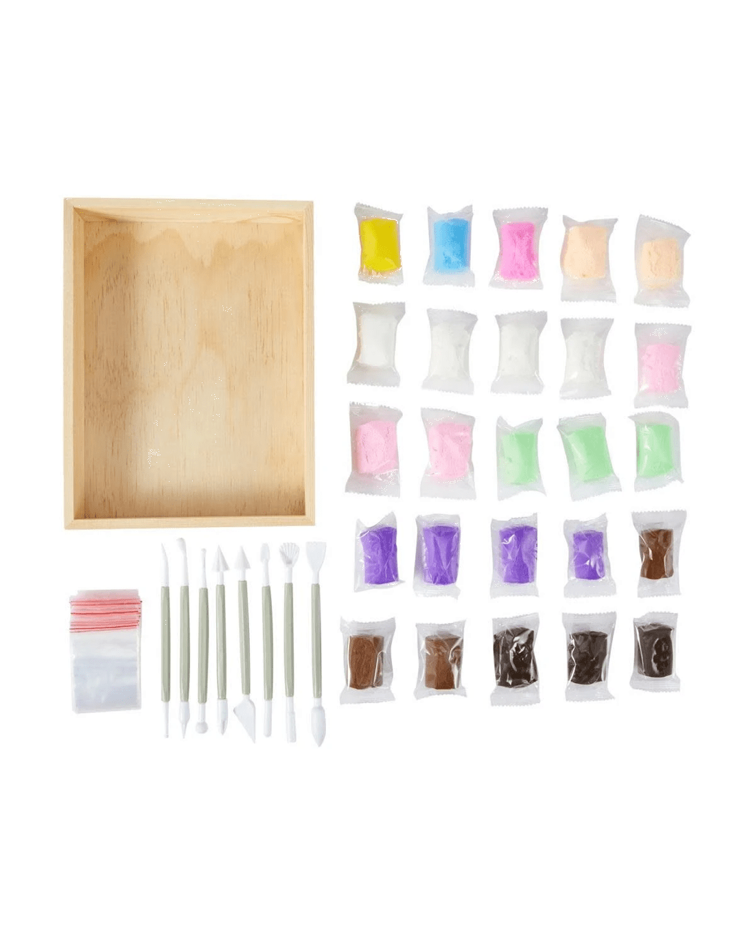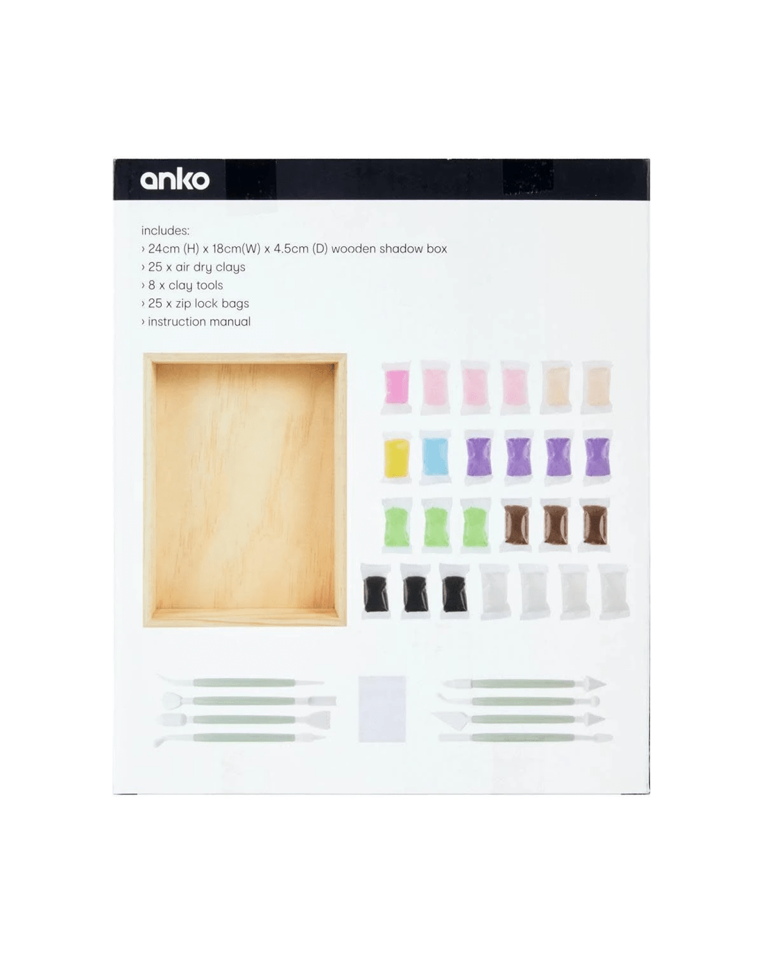 • Includes wooden shadow box, 25 x soft air dry clays, 8 x clays, 25 x zip lock bags and 1 x instruction manual