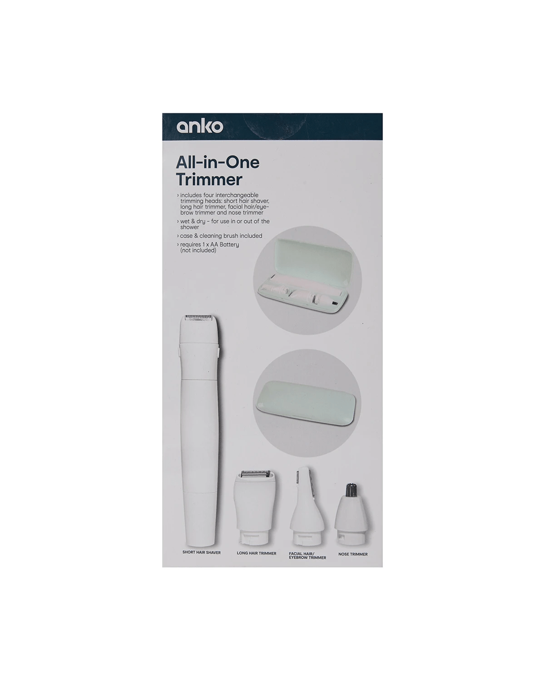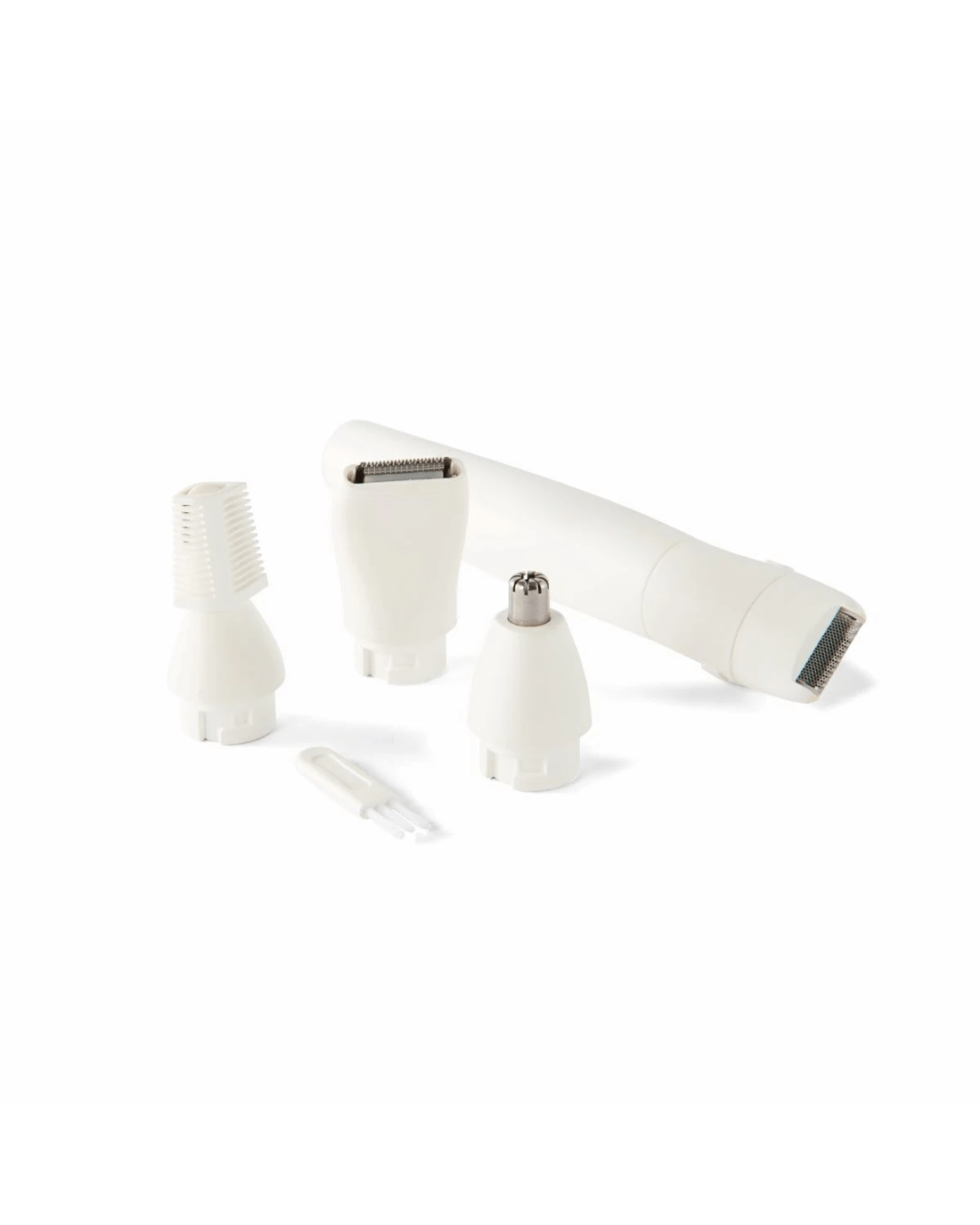 • Includes trimmer, 4 interchangeable trimming heads: short hair shaver, long hair trimmer, facial hair/eye-brow trimmer and nose trimmer, case and cleaning brush