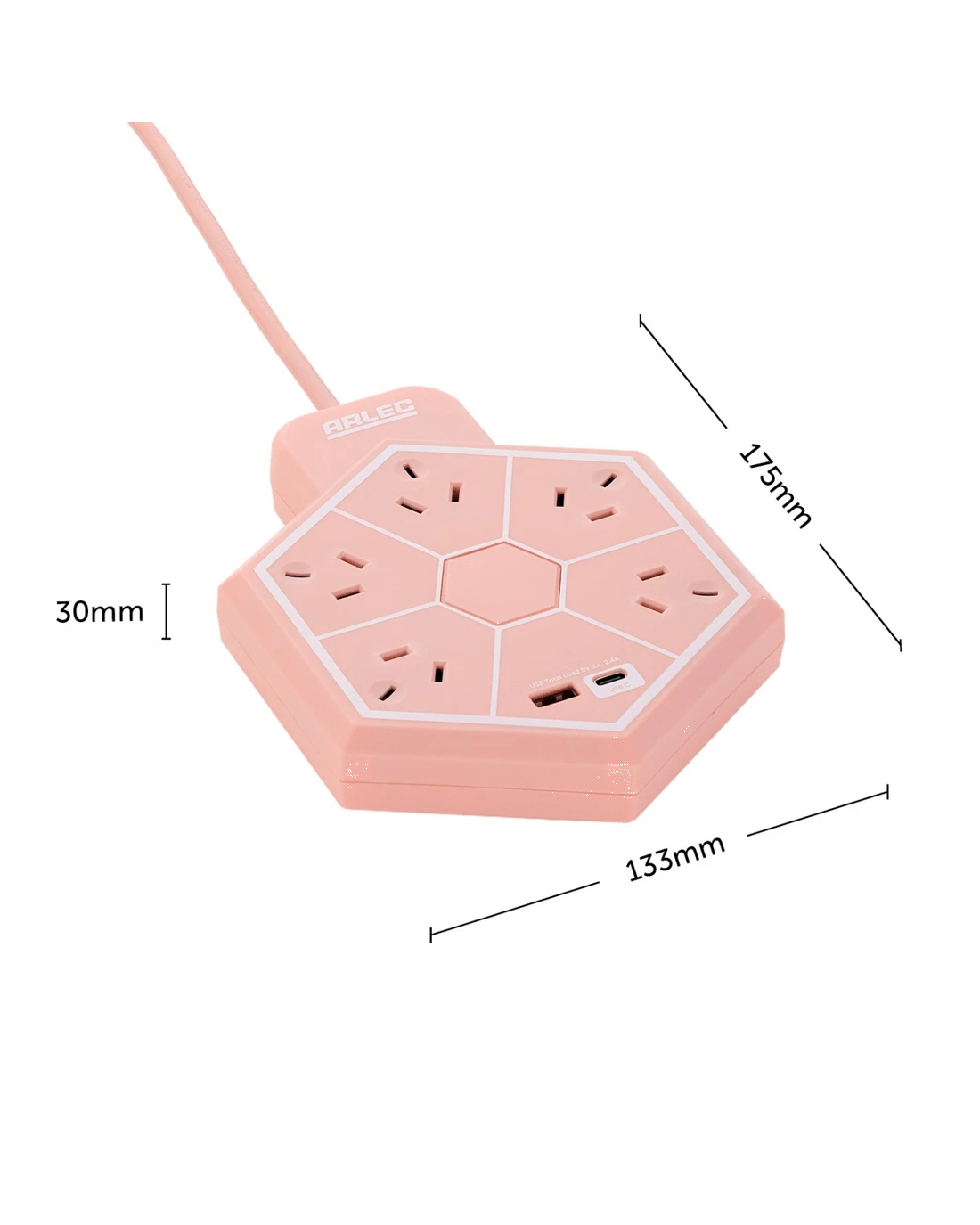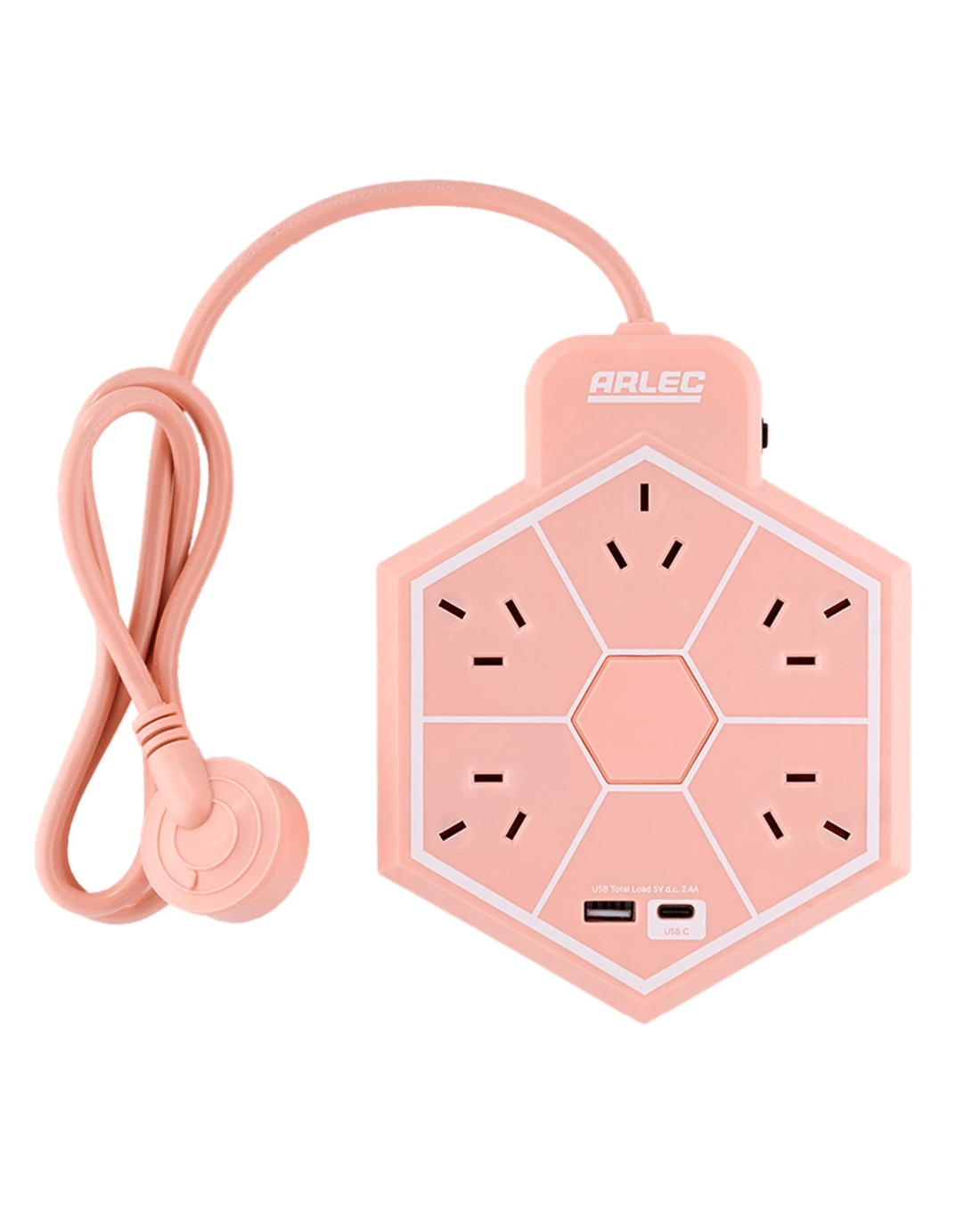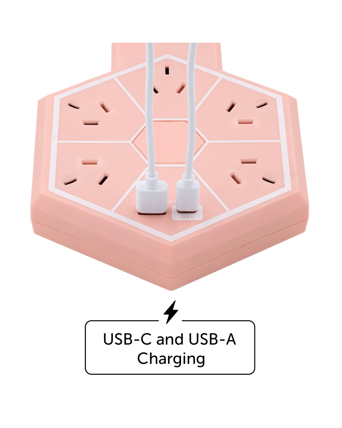 Charge and power with style using this 5 outlet powerboard featuring a vibrant pink hexagon design and built-in USB-A and USB-C ports. Ideal for desks, bedrooms or workspaces, it lets you connect multiple devices while keeping things neat, colourful and efficient. Compact, modern and multifunctional.