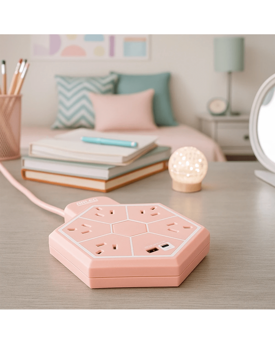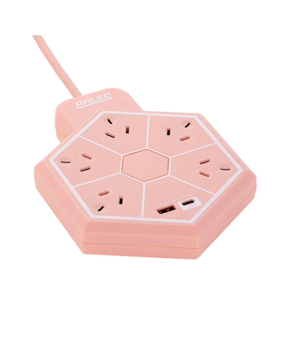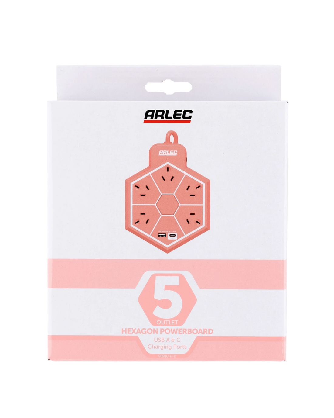 Charge and power with style using this 5 outlet powerboard featuring a vibrant pink hexagon design and built-in USB-A and USB-C ports. Ideal for desks, bedrooms or workspaces, it lets you connect multiple devices while keeping things neat, colourful and efficient. Compact, modern and multifunctional.