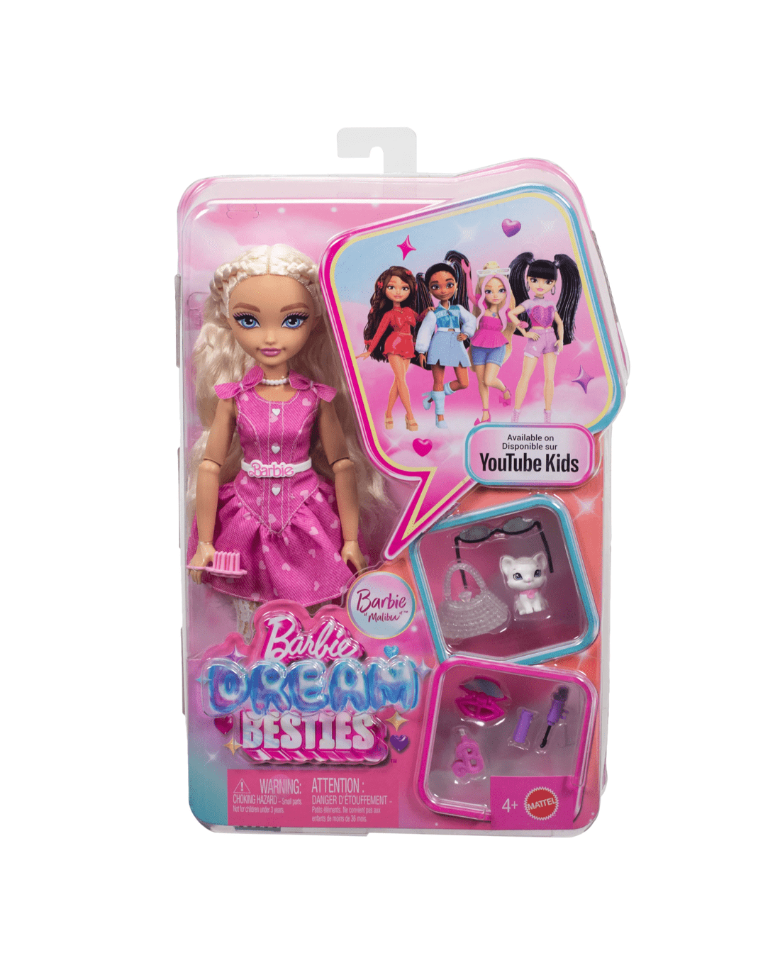 Barbie Dream Besties dolls encourage kids to share their unique talents with the world, just like Barbie 'Malibu'! Barbie 'Malibu' has dreams of owning her own makeup company. Kids can help her chase her dreams with seven different styling-themed accessories, including a mascara wand, lipstick, glittery purse and even a pet kitten! The fashion doll has long, blonde wavy hair for styling fun and engaging play. With so many opportunities for storytelling, Barbie Dream Besties dolls inspire kids aged four years old and up to live out their dreams.