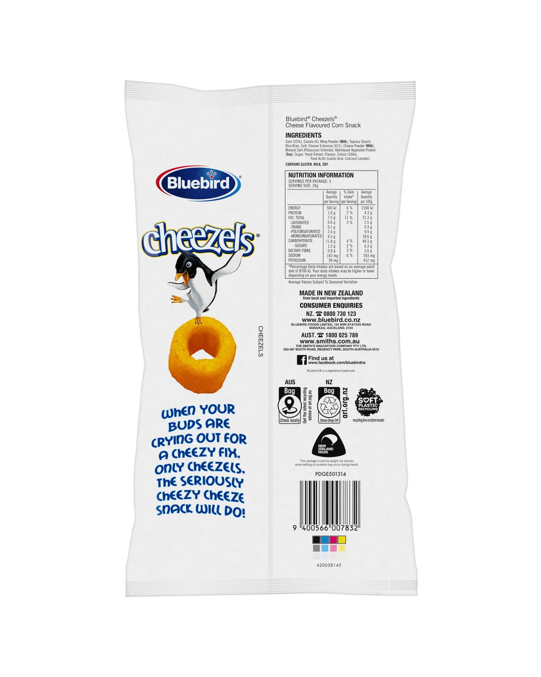 - Ingredients: Corn (55%), Canola Oil, Whey Powder (Milk), Tapioca Starch, Rice Bran, Salt, Flavour Enhancer (621), Cheese Powder (Milk), Mineral Salt (Potassium Chloride), Hydrolysed Vegetable Protein (Soy), Sugar, Yeast Extract, Flavour, Colour (160e), Food Acids (Lactic Acid, Calcium Lactate)