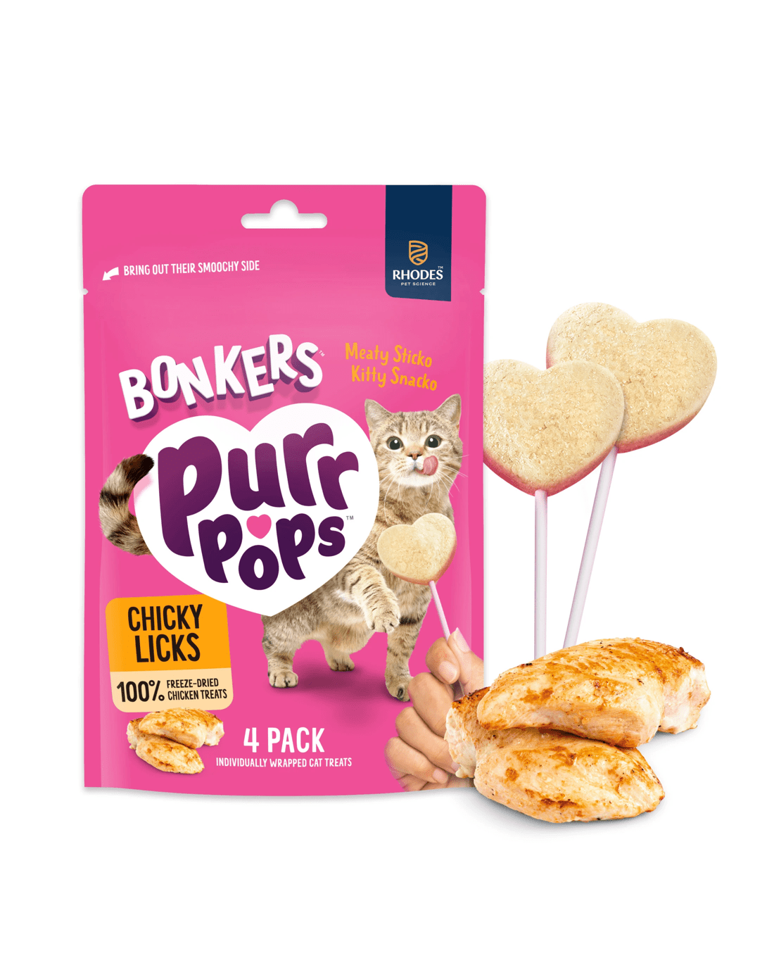 Treat your cat to BONKERS Purrpops Chicky Licks flavor lollipop cat treats, the newest way to connect with your cat. Cats can't speak human. But if they could, BONKERS Purrpops cat treats would leave them speechless. Not just because it's hard to talk cat with a Purrpop in your mouth. But because it's shockingly good. A meaty, chewy, crunchy, bitey cat-candy. 100% freeze-dried chicken, served on a stick. No words, just purrs. Standard Purrpops reaction.