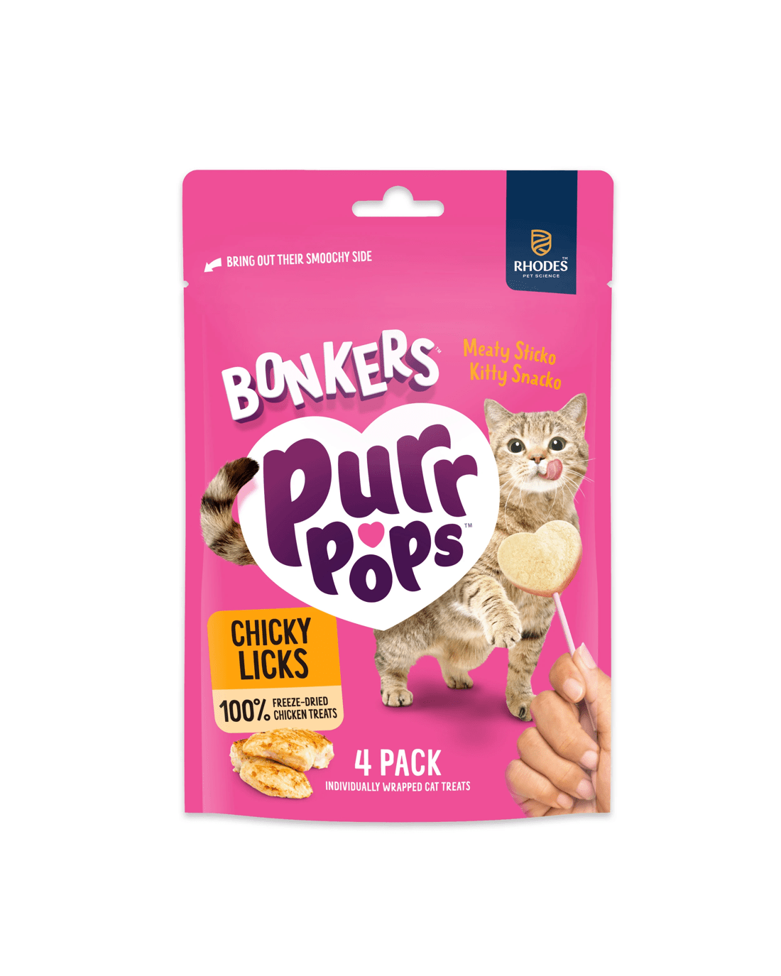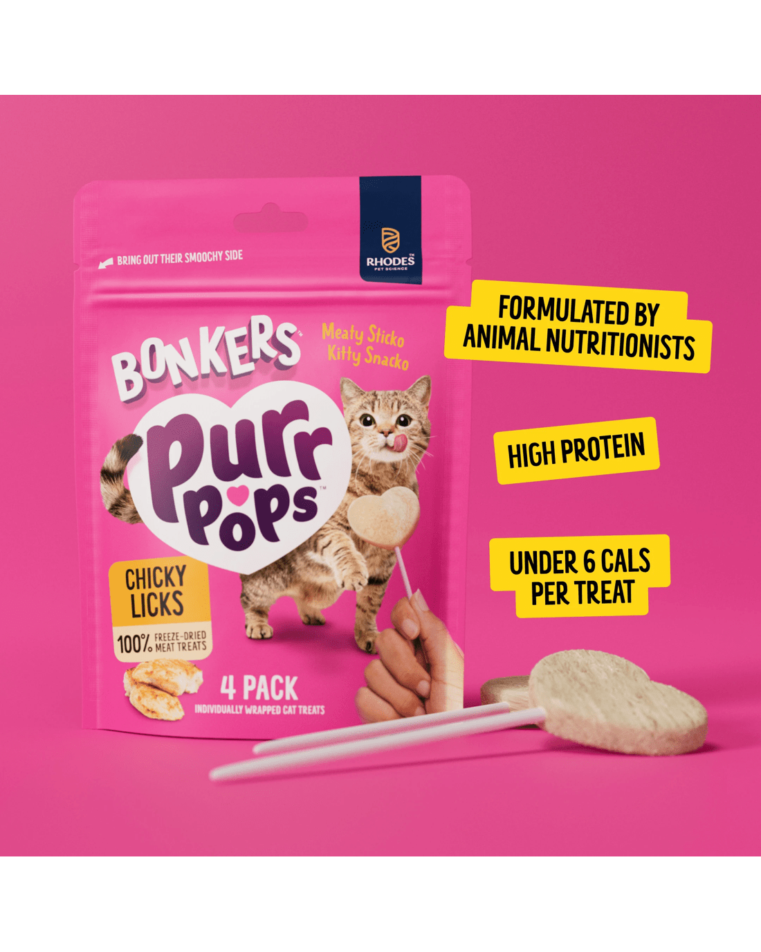 Features- Pack of 4 lollipop treats: Each pack includes four high-protein, lollipop-style treats, designed for a uniquely BONKERS way to treat your cat