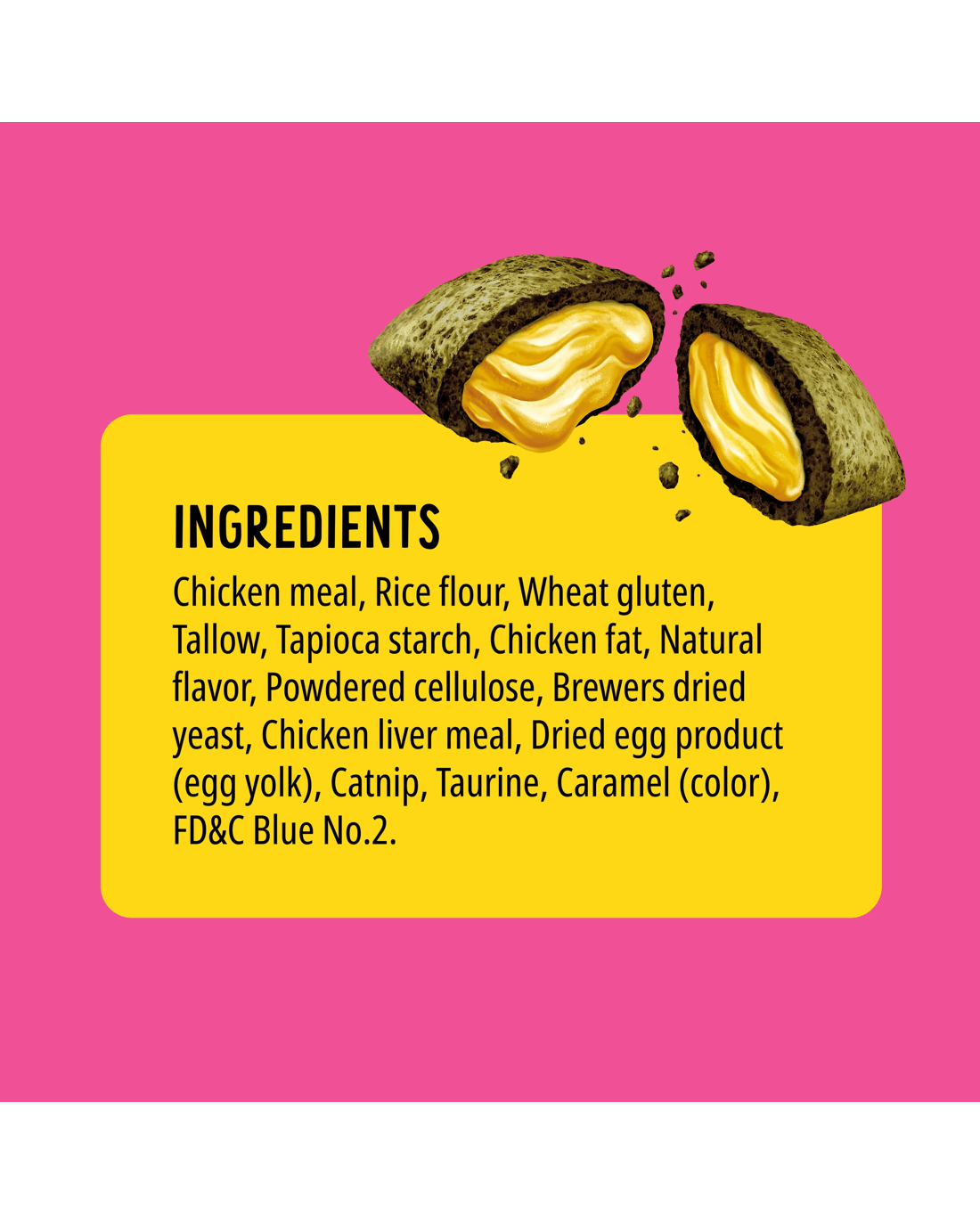 • Ingredients: Chicken meal, Rice flour, Wheat Gluten, Tallow, Tapioca starch, Chicken fat, Natural flavor, Powdered cellulose, Brewers dried yeast, Chicken liver meal, Dried egg product (egg yolk), Catnip, Taurine, Caramel (colour), FD&C Blue No.2