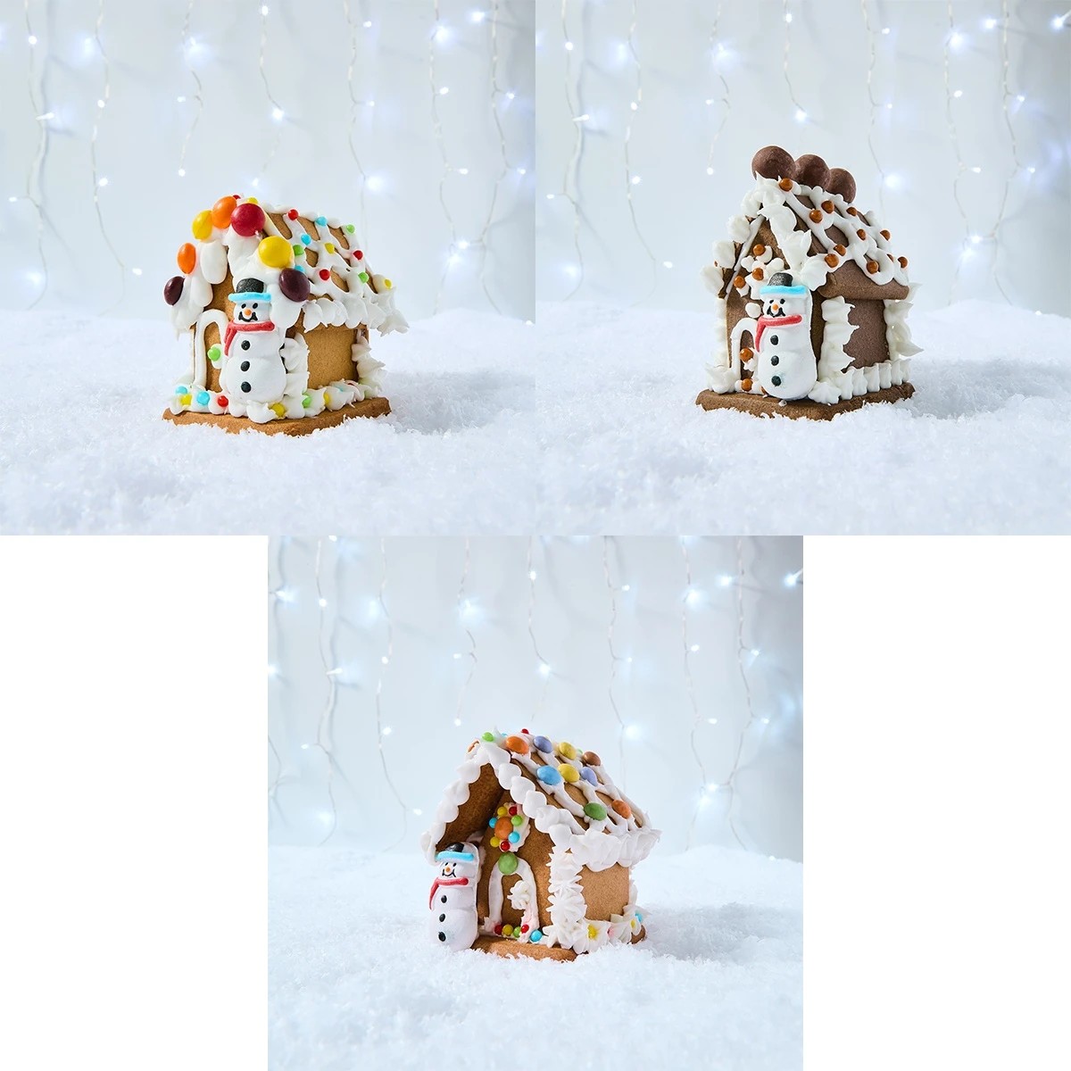 - Gingerbread candy cabin: Gingerbread cookies, 1 x white icing, 1 x candy balls, 1 x snowman icing figure and 1 x bite size candies