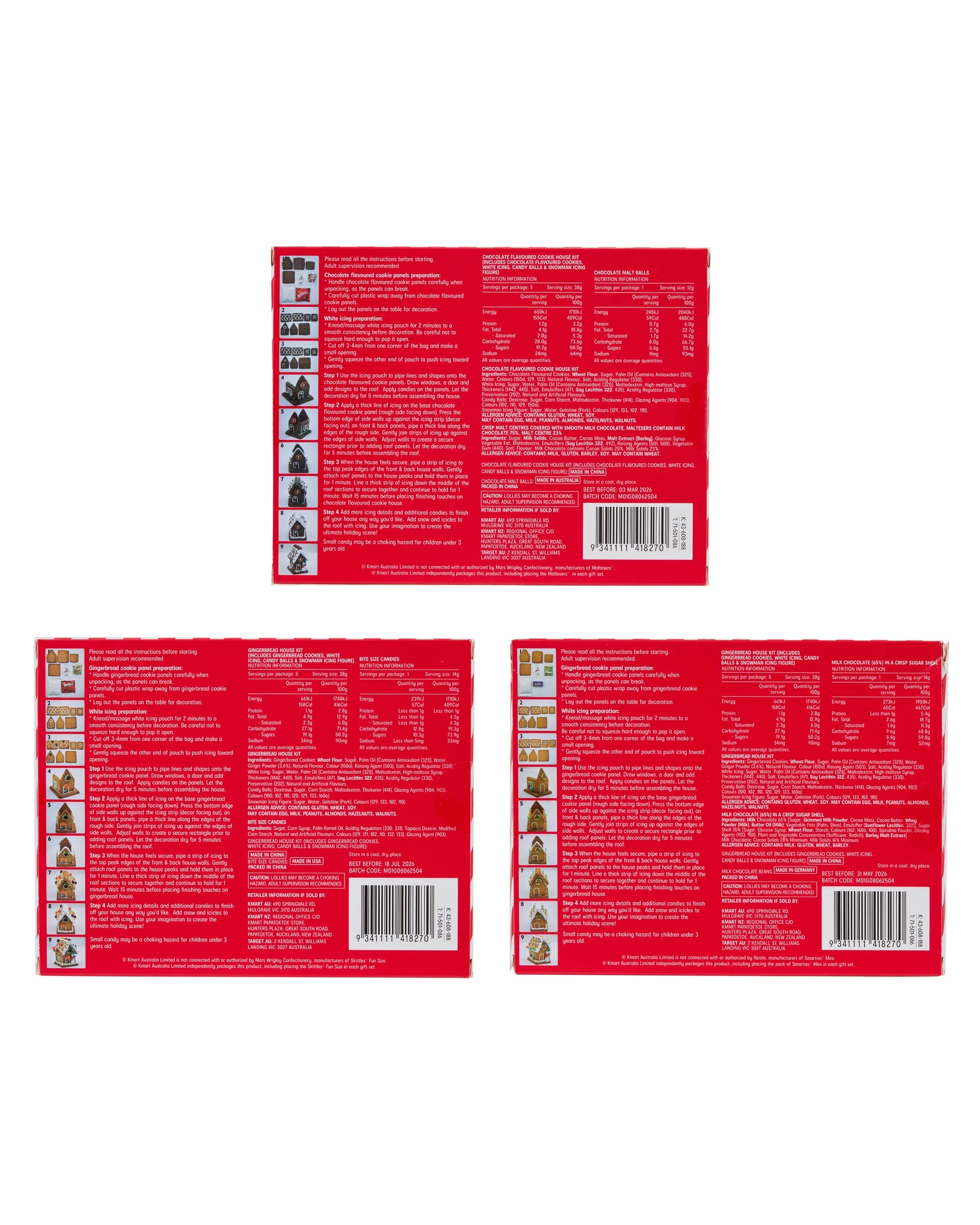 - Made in China (gingerbread cookies, white icing, candy balls and snowman icing figure), made in USA (bite sized candies), made in Australia (chocolate malt balls) and made in Germany (milk chocolate beans)