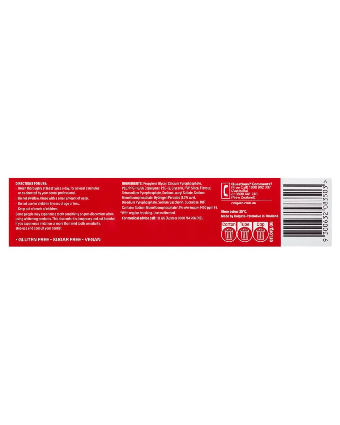 - Ingredients: Propylene Glycol, Calcium Pyrophosphate, Glycerin, PEG/PPG116/66 Copolymer, PEG12, PVP, Silica, Flavour, Sodium Lauryl Sulfate, Tetrasodium Pyrophosphate, Sodium Monofluorophosphate, Hydrogen Peroxide, Disodium Pyrophosphate, Sodium Saccharin, Sucralose, BHT