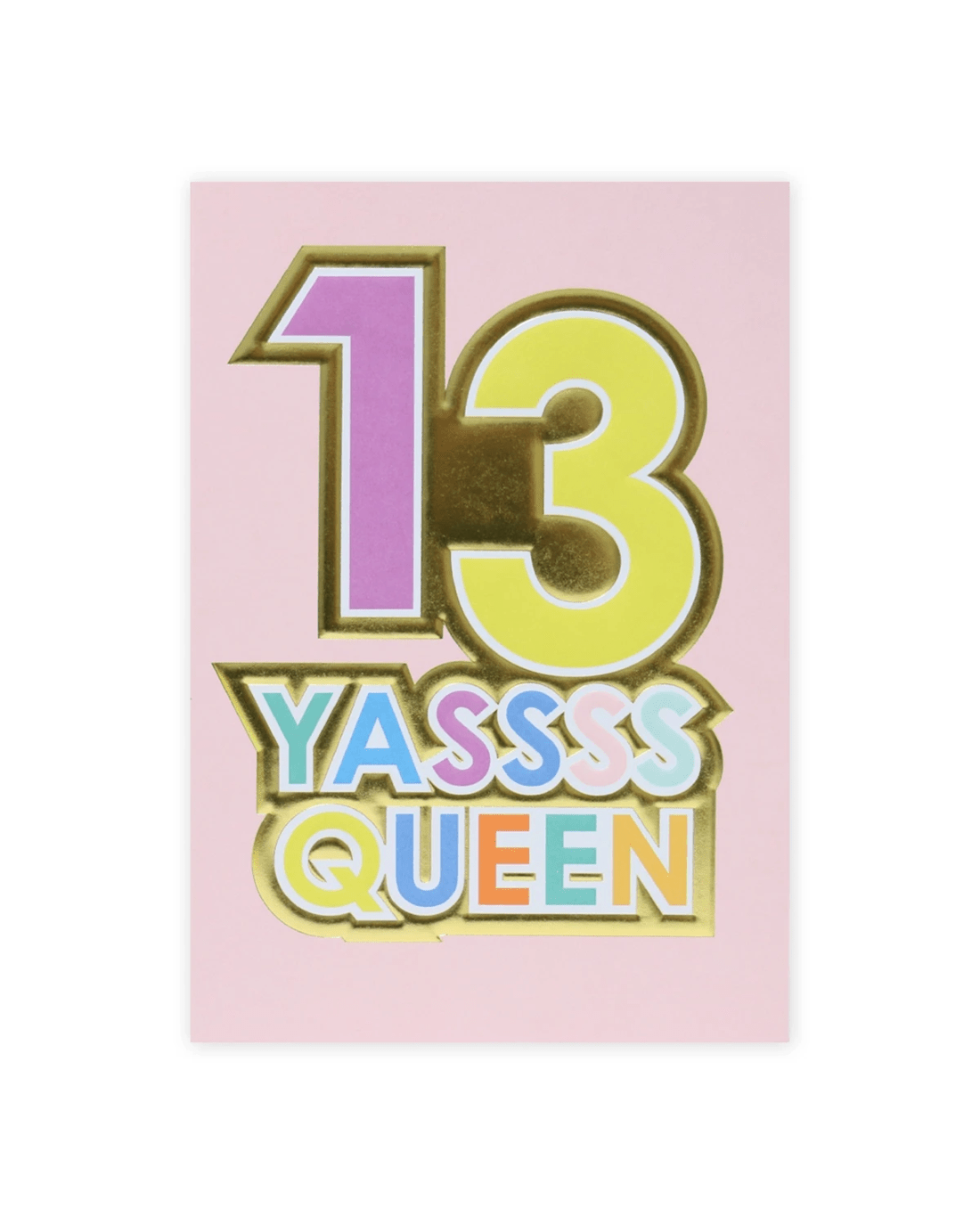 - The front of the card features embossed elements, gold foil highlights and the message '13 YASSSS QUEEN'